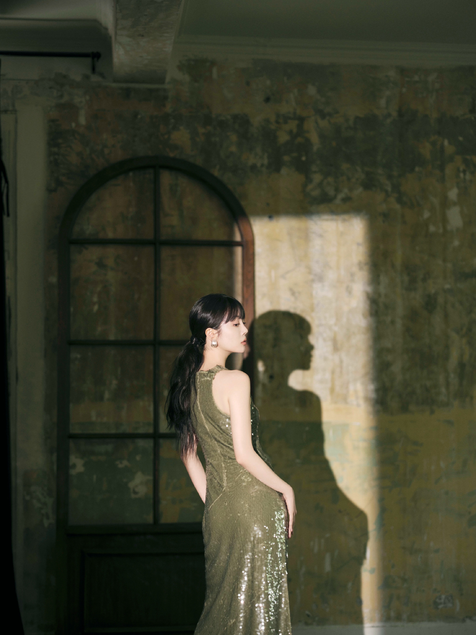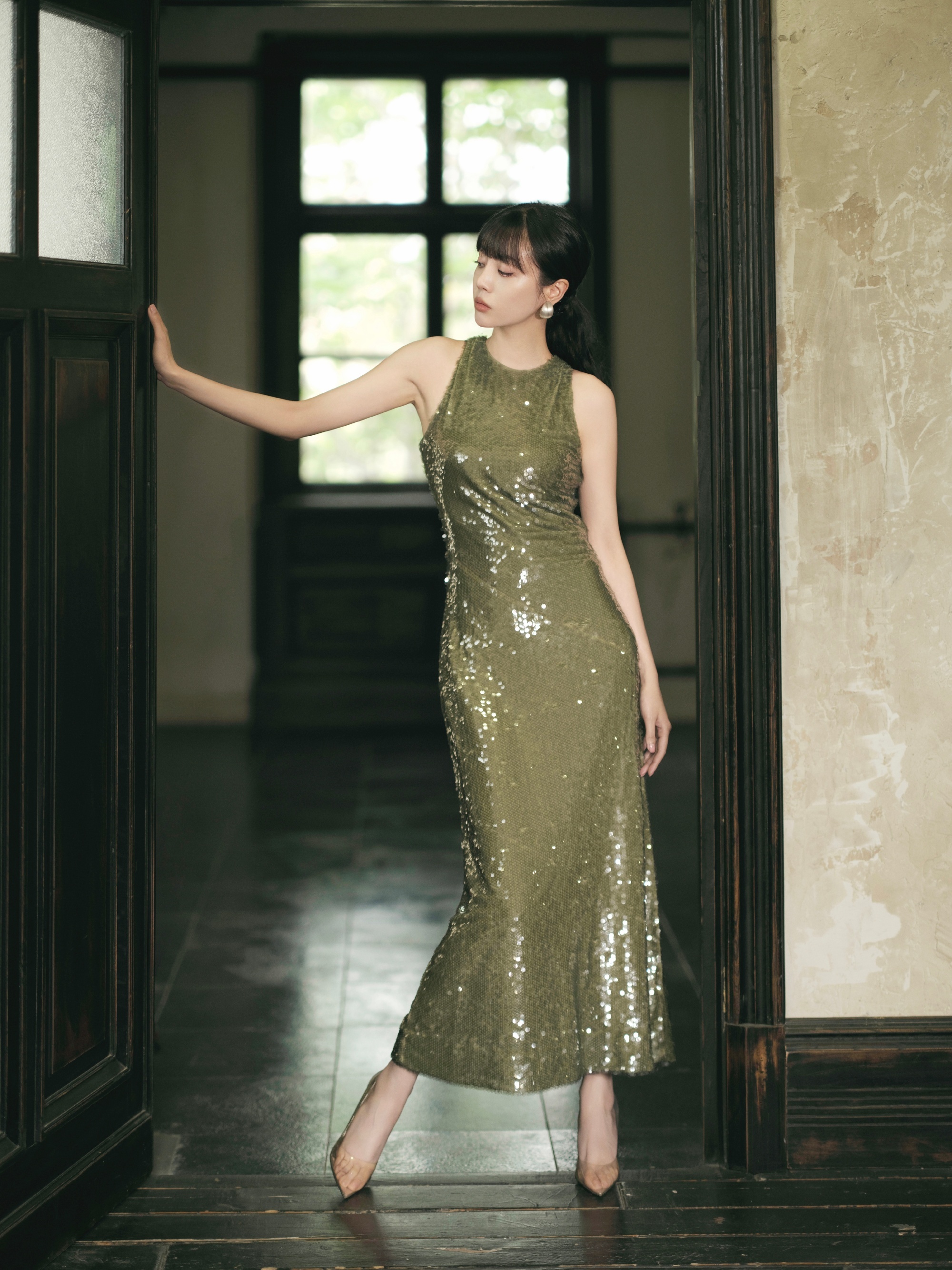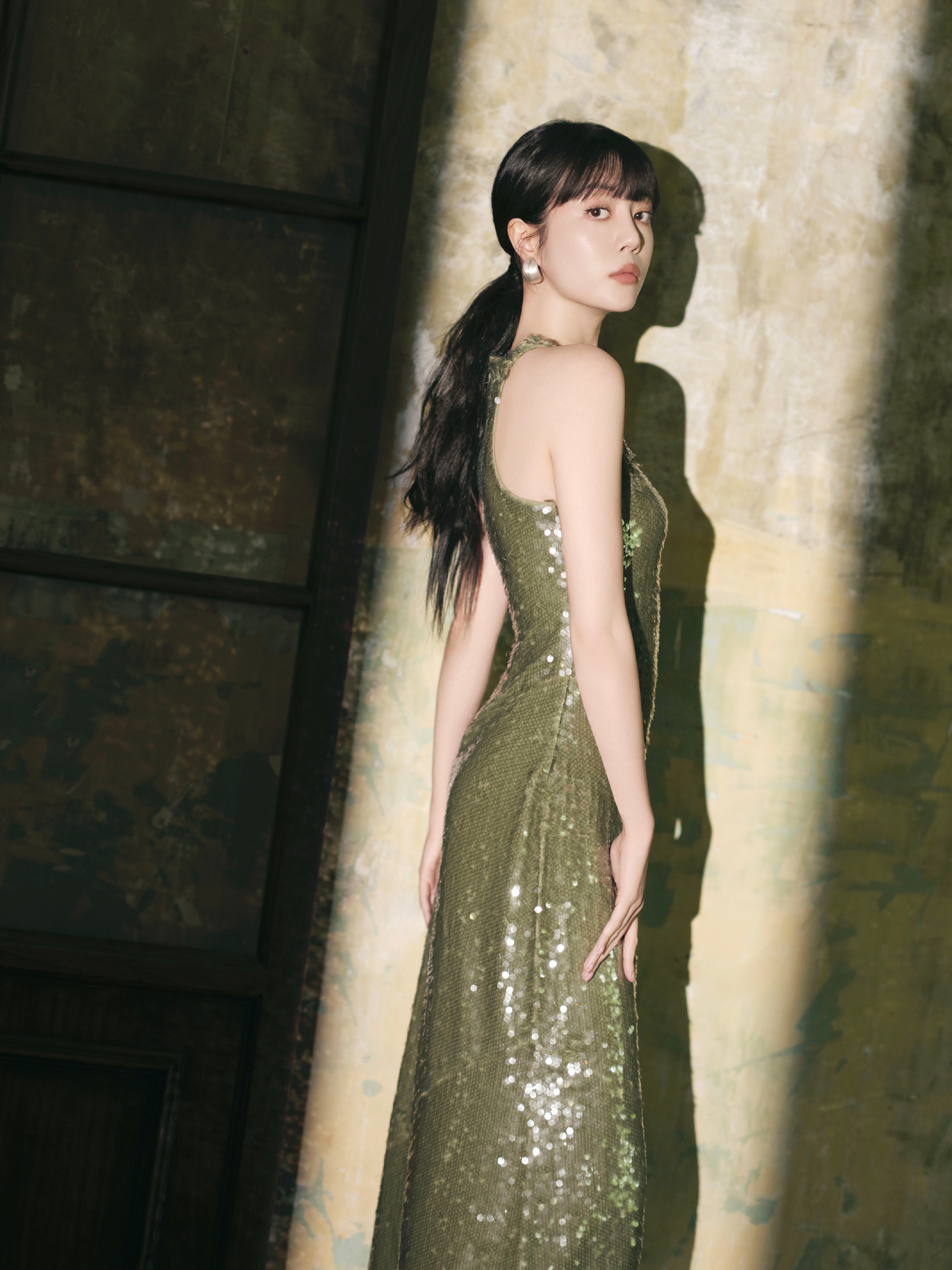 李溪芮烟色修身长裙,扎马尾的姐姐别具优雅韵味。李溪芮