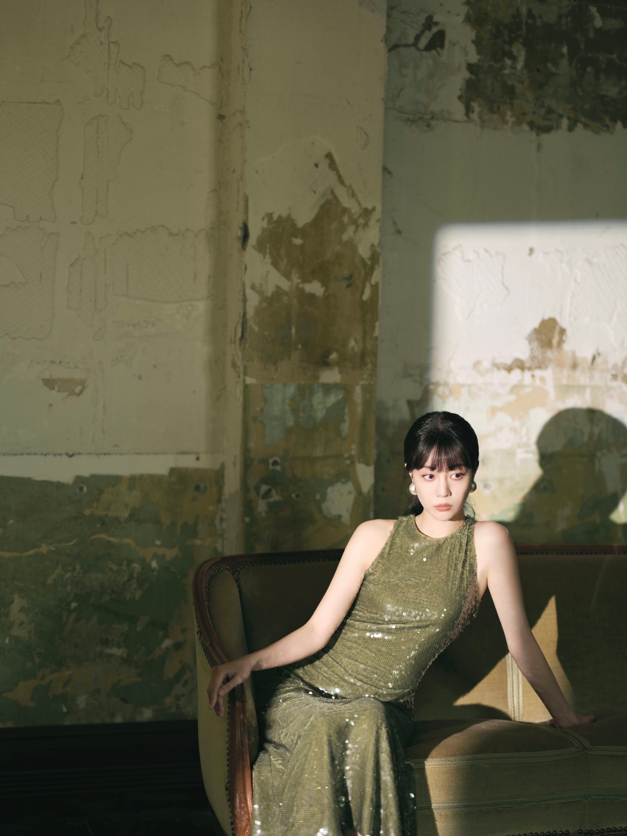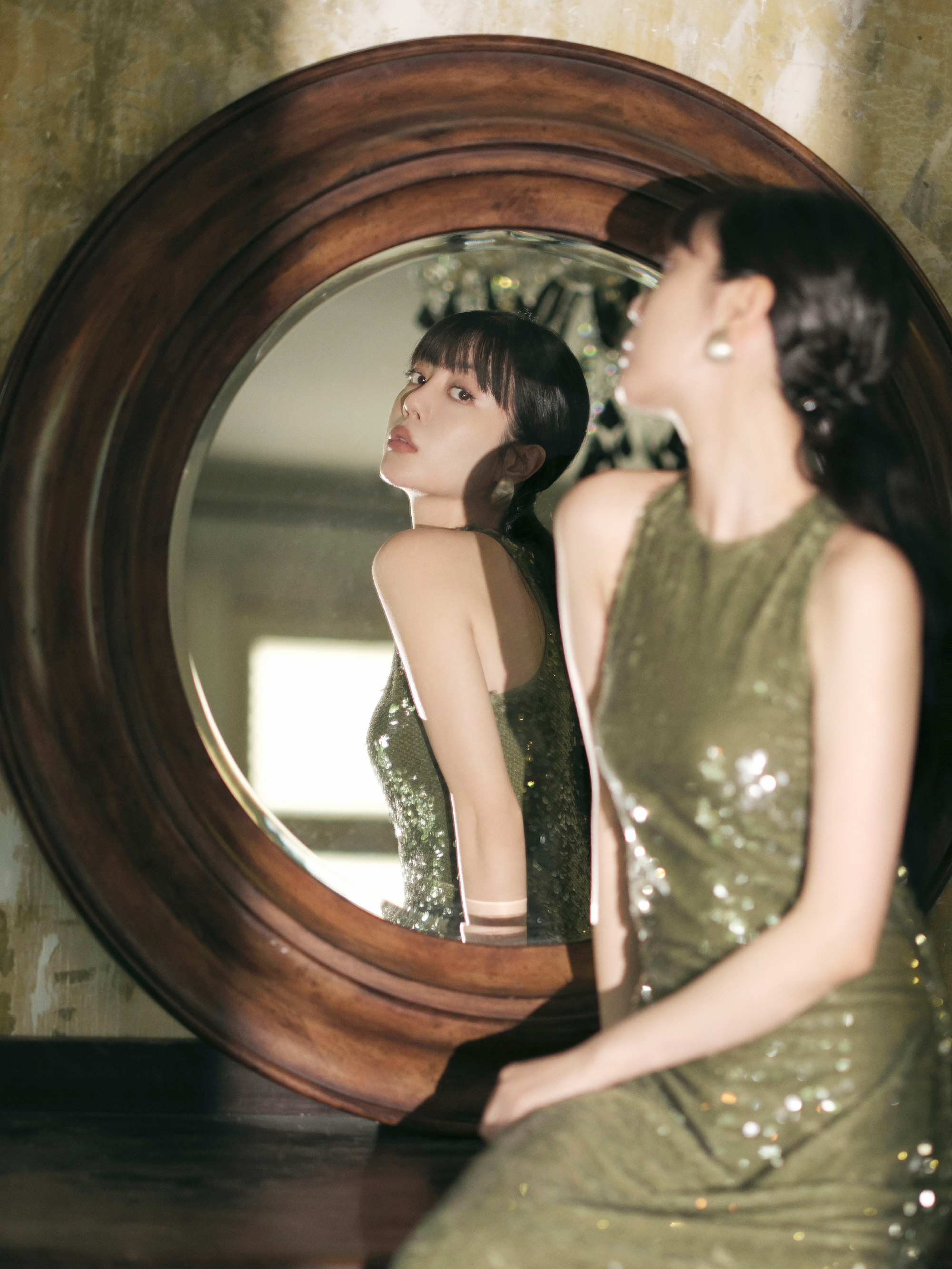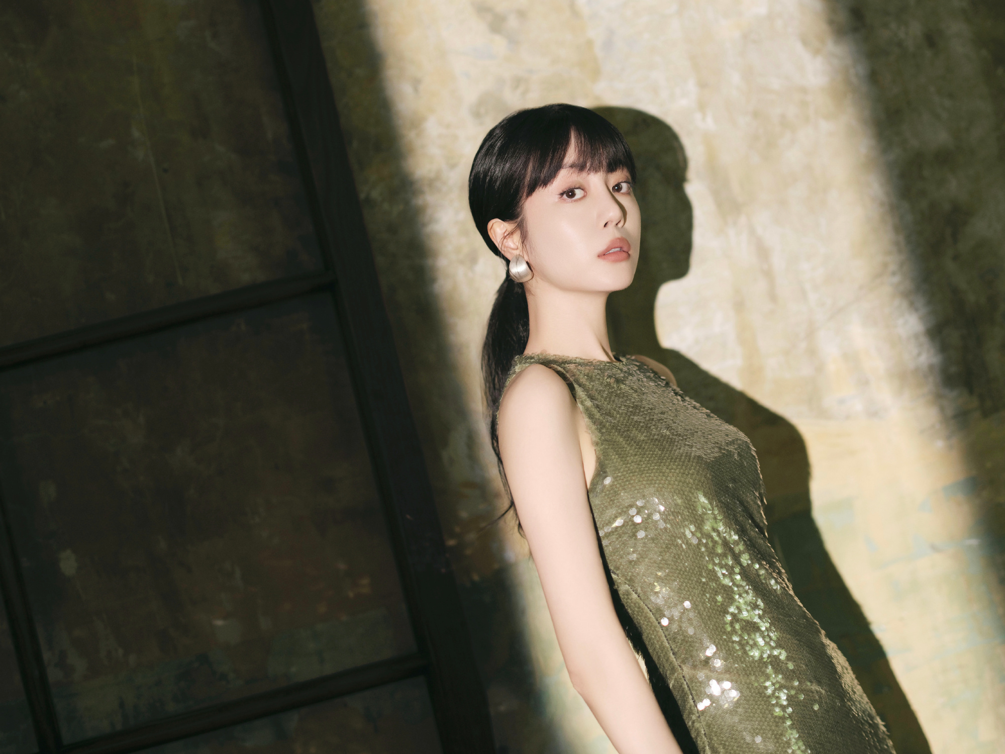 李溪芮烟色修身长裙,扎马尾的姐姐别具优雅韵味。李溪芮