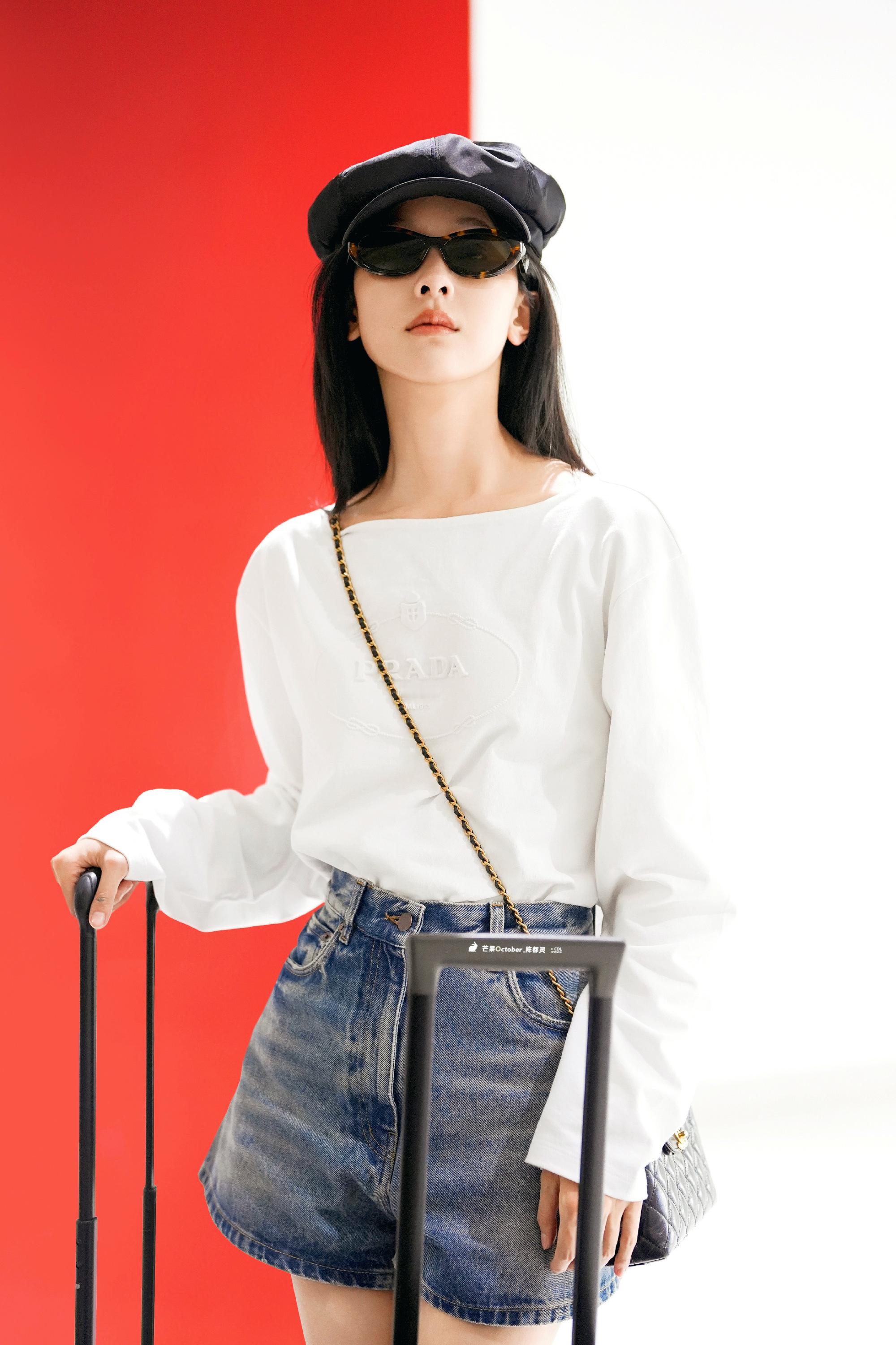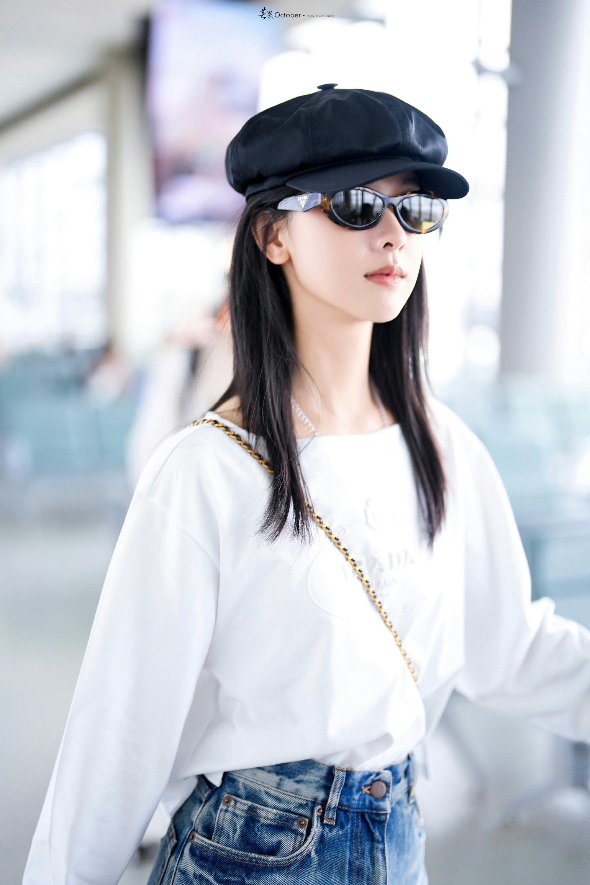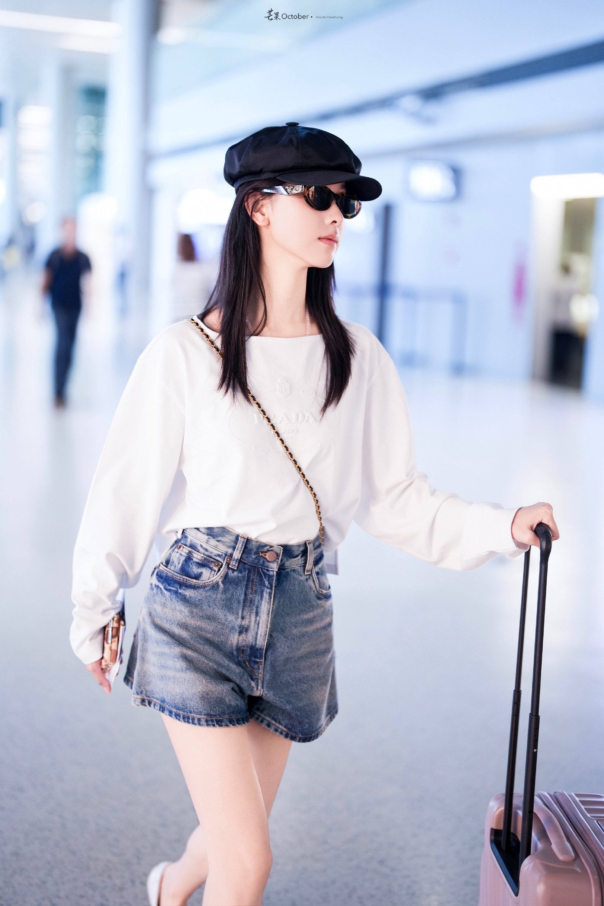 陈都灵机场照,白衣牛仔,甜酷的嘟嘟。陈都灵