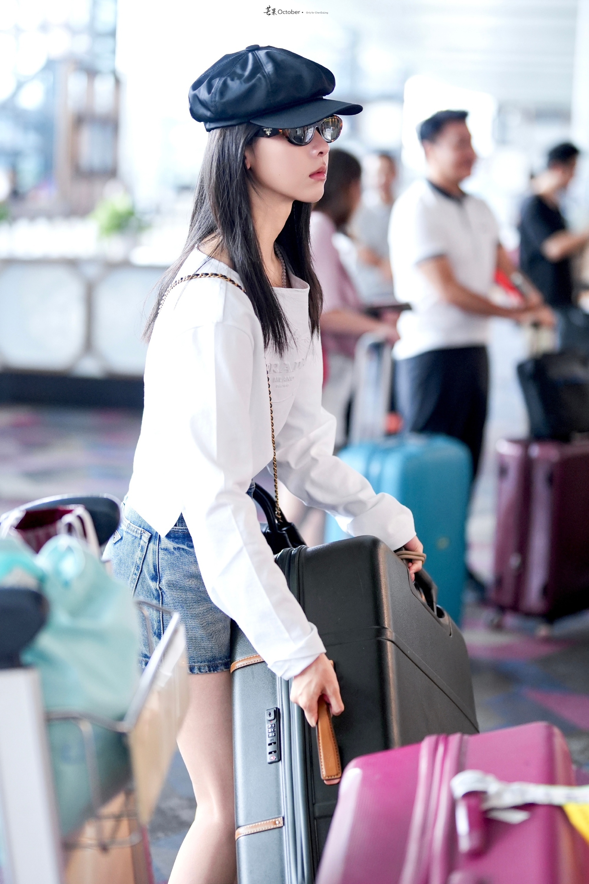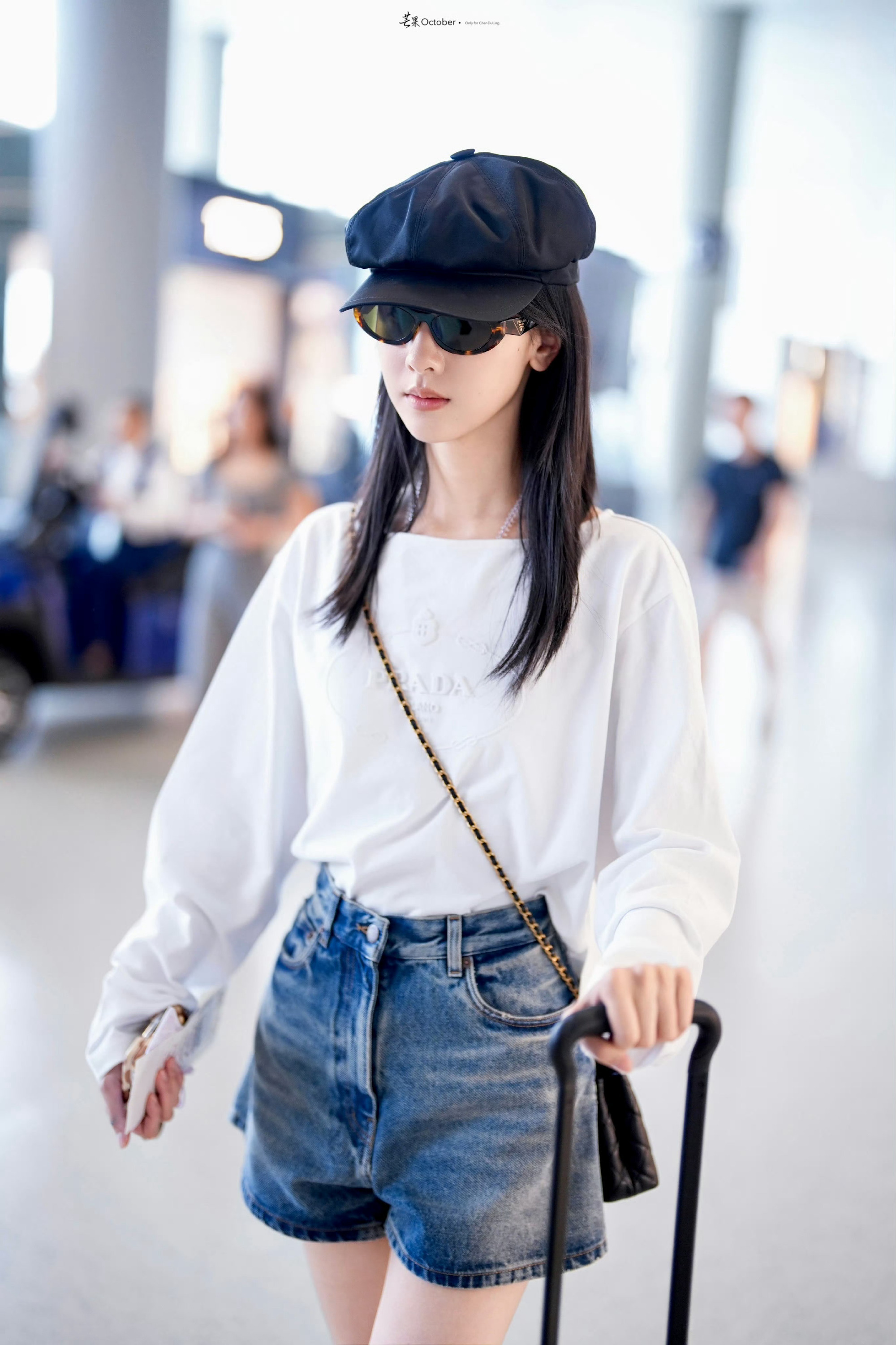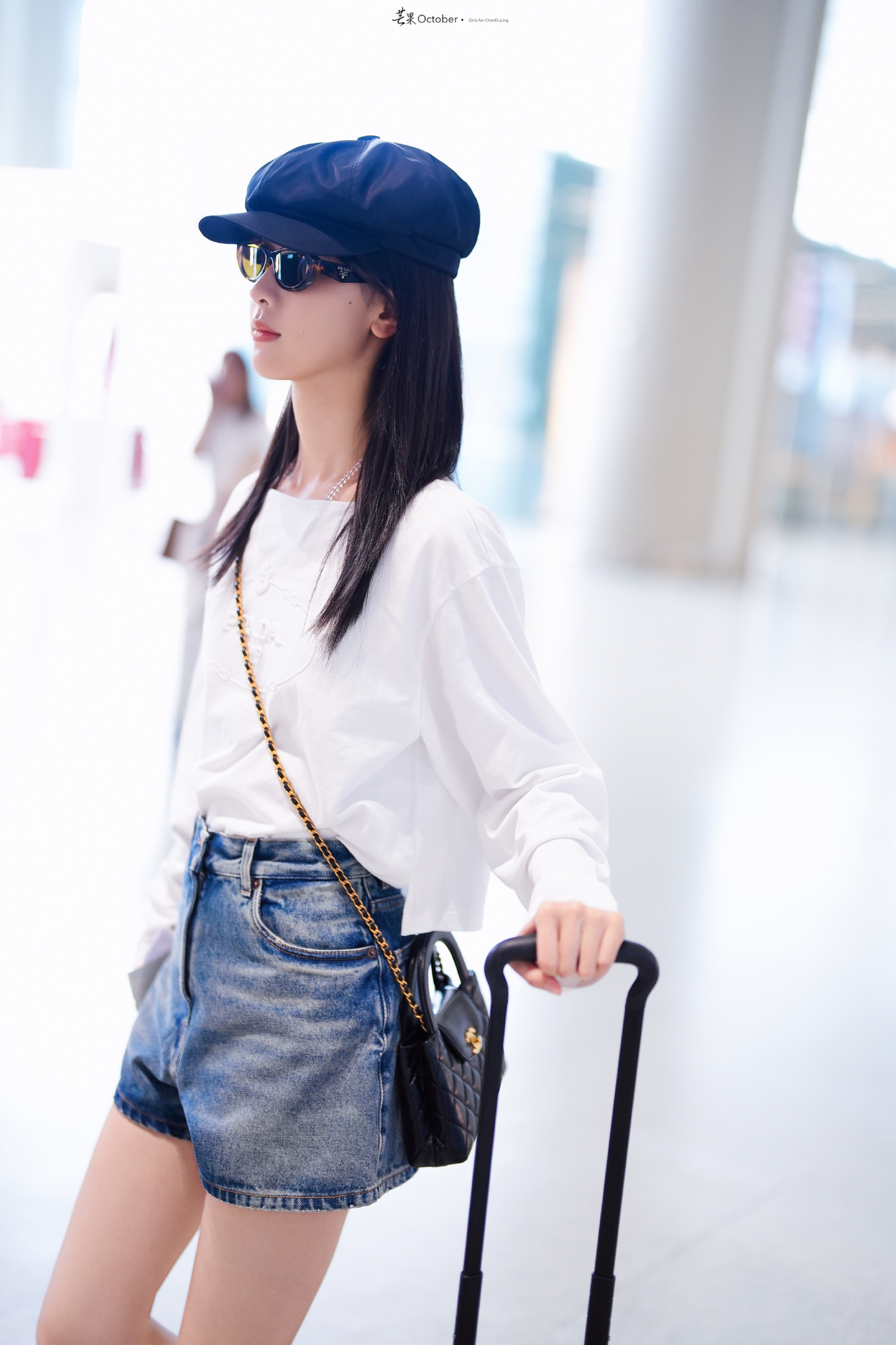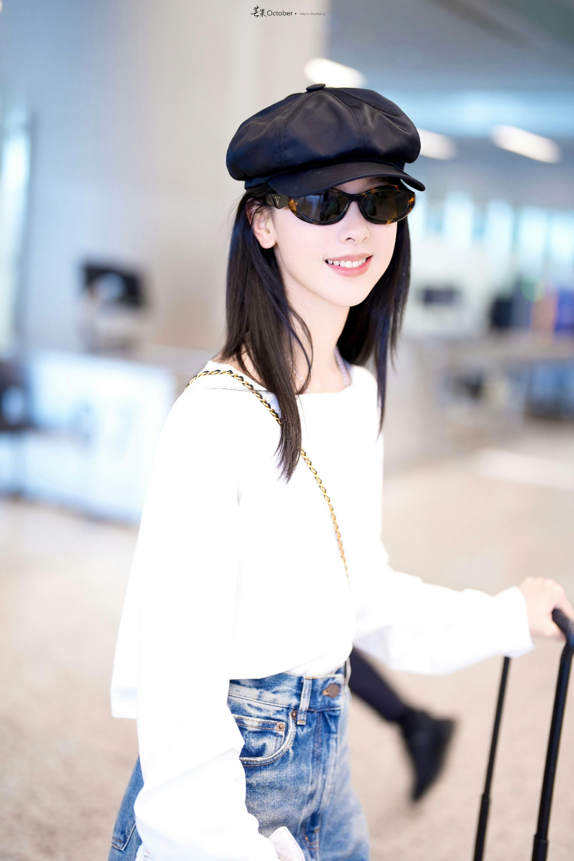 陈都灵机场照,白衣牛仔,甜酷的嘟嘟。陈都灵