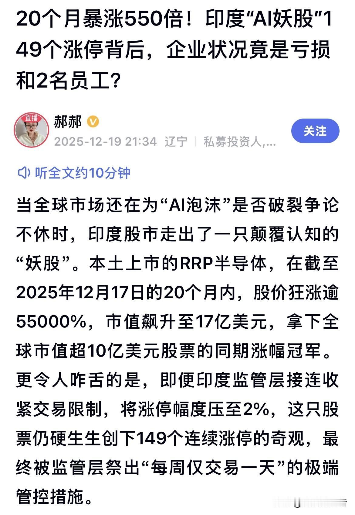 两名员工的半导体芯片公司,连续涨停149个交易日,股票大涨550倍,拿下全球股市同期涨幅冠军,市值飙升至17亿美元,当然这种奇特的涨幅是发生在印度股市。 印度股市到现在只有这一家半导体芯片公司,它就是RRP公司,而且还是房地产转型过来的,公司现在也没有正式制造半导体芯片,当然目前也没这个能力。 但它有这个概念、而且未来的发展方向就是半导体,物以稀为贵,股价的大涨基本与基本面和业绩无关,网络炒作,极小的自由流通盘,加上印度不断壮大的散户群体。 由于本土没有上市芯片公司,散户投资者为了蹭上“全球半导体热”,所以打造出了这样一只能当作替代标的的股票。 而且印度股市是有涨跌限制的,一般股票的涨跌幅度限制为10%,也有5%和20%的,这只股票由于涨幅太大,印度监管机构已经限制涨幅为2%,会因为此,所以更是开盘就涨停,因为上涨幅度太小了,而投资者需求太大。 149个涨停后或许不是终点,继续上涨的可能性还很大,因为就这么一家概念公司,目前这家公司也是亏损现状,正式员工只有两名。如果他们可以减持,那么发展资金不就有了。