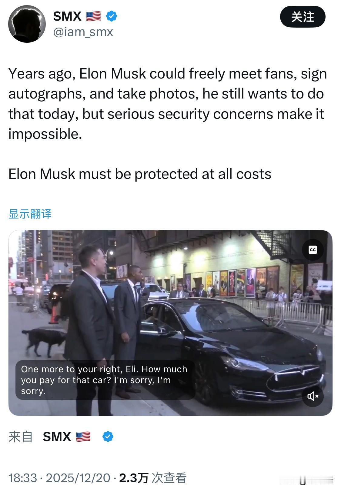 多年前,埃隆·马斯克可以自由地与粉丝见面、签名和合影,他今天仍然想这样做,但严重的安全问题使之成为不可能。 必须不惜一切代价保护埃隆·马斯克。