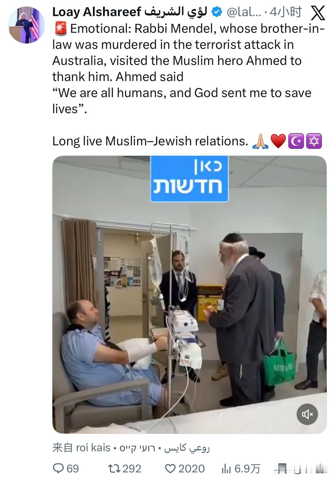 拉比门德尔·卡斯特尔(Rabbi Mendel Kastel)的姐夫埃利·施兰格(Eli Schlanger)在这次由一对父子发动的反犹恐怖袭击中不幸丧生。 在袭击发生后不久,拉比门德尔·卡斯特尔亲自前往医院探望正在康复中的艾哈迈德,代表受害者家属和犹太社区向这位穆斯林英雄表达了诚挚的感谢。 艾哈迈德说 “我们都是人类,上帝派我来拯救生命。” 此次袭击造成至少15人死亡,是澳大利亚数十年来最严重的枪击事件。艾哈迈德的英雄事迹引发了巨大反响,犹太社区发起的众筹活动已为他筹集了超过130万澳元的医疗及生活基金,以表彰他在危难时刻展现的超越宗教和种族的人道主义精神。 “拉比”(Rabbi)在犹太教和犹太文化中是一个至关重要的角色,其字面含义是“老师”、“智者”或“大师”。 拉比并非传统意义上拥有“神权”的祭司,而是犹太社群中精通犹太律法(Halakha)和经典(如《塔木德》)的学者。在上帝面前,拉比的宗教地位与普通犹太人平等,但他们因其渊博的知识而受到敬重。 拉比门德尔·卡斯特尔(Rabbi Mendel Kastel OAM)是澳大利亚悉尼极具影响力的犹太社群领袖和社会活动家,现任悉尼著名慈善机构 “犹太之家”(Jewish House) 的首席执行官(CEO)。