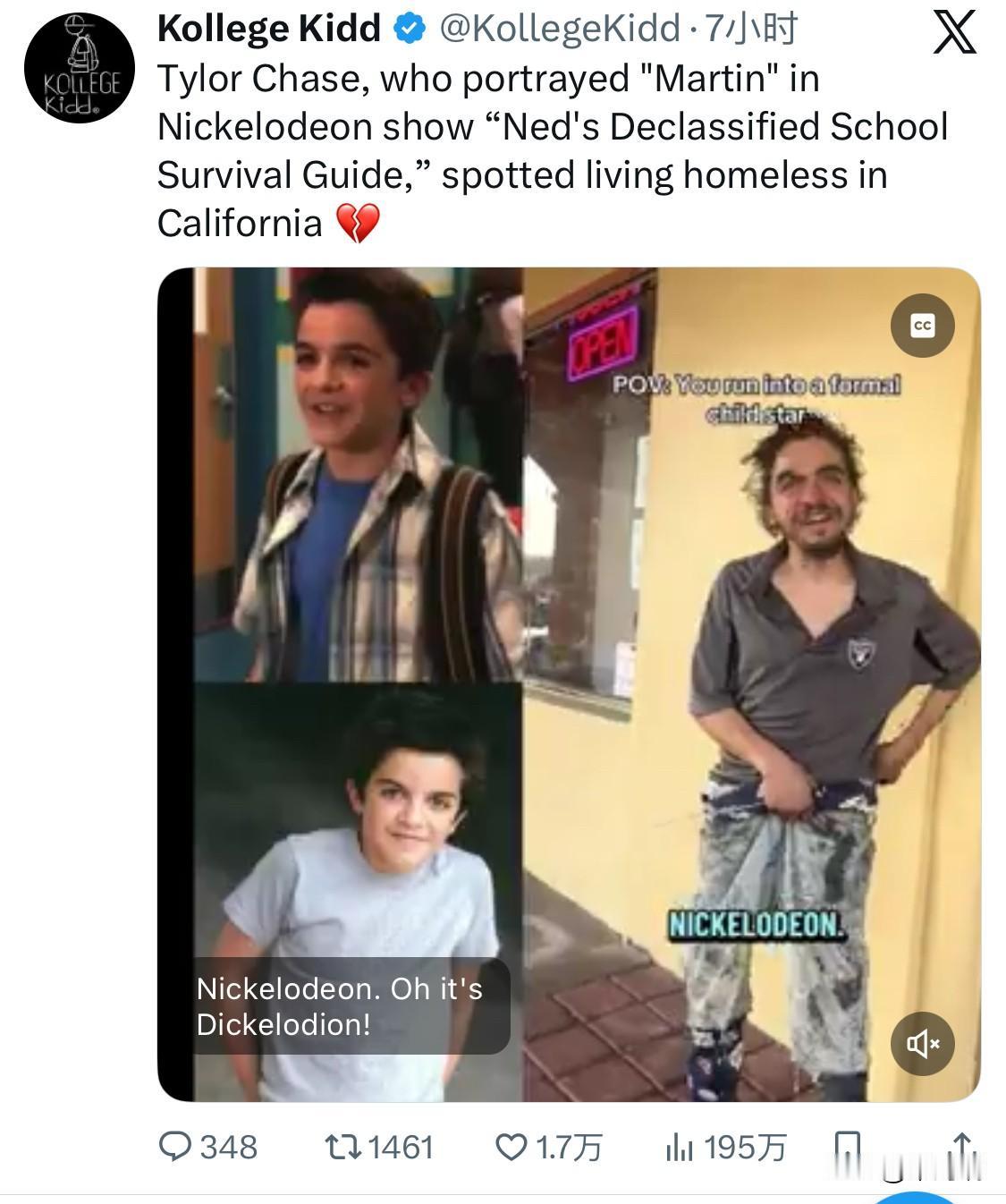 曾在尼克儿童频道(Nickelodeon)经典剧集《奈德的校园生存指南》(Ned's Declassified School Survival Guide)中饰演“马丁”(Martin Qwerly)的演员泰勒·蔡斯(Tylor Chase),其无家可归的情况于2025年下半年引起了公众广泛关注。 2025年9月,一位网红在加利福尼亚州河滨市(Riverside)的街头偶遇了正在流浪的泰勒·蔡斯。 现年36岁的蔡斯看起来比实际年龄苍老许多,被描述为“几乎认不出来”。他在视频中确认了自己的身份,并提到自己正面临严重的财务和生活困境。 泰勒的母亲在社交媒体上发声,指出他目前正面临心理健康和药物成瘾的问题。他的母亲表示,单纯的资金捐助并不能从根本上解决问题,因为泰勒目前缺乏管理金钱和按时服药的能力。他真正需要的是专业的长期医疗护理和心理治疗。 社会反响与援助 筹款行动:发现他的网红最初发起了 GoFundMe 筹款项目,旨在帮助他重新站稳脚跟。随后,部分筹集到的资金(约1,200美元)被用于为他购买衣物、鞋子以及进行简单的仪容打理。 剧组发声:曾在剧组中饰演“Cookie”的演员 Daniel Curtis Lee 在社交媒体上表达了支持。许多粉丝也呼吁该剧的播客主持人(Devon Werkheiser 和 Lindsey Shaw)关注并利用平台力量为他寻求专业帮助。 泰勒·蔡斯因在2004年至2007年播出的《奈德的校园生存指南》中饰演喋喋不休、智商超群的马丁·奎利而为人熟知,其现状令众多看着该剧长大的观众感到唏嘘。 尼克儿童频道(Nickelodeon,简称 Nick)是全球知名的美国有线电视频道,也是历史上第一个专门为儿童和青少年开设的电视频道。 开播时间:最初于1977年12月1日以“Pinwheel”之名进行测试,后于1979年4月1日正式作为全国性频道启动。 所属集团:目前由 Paramount Skydance(派拉蒙与 Skydance 传媒合并后形成的新实体,原隶属于派拉蒙全球)旗下的派拉蒙媒体网络(Paramount Media Networks)拥有。 受众群体:主要面向2至17岁的儿童和青少年,并针对不同年龄段设有细分板块和姊妹频道。