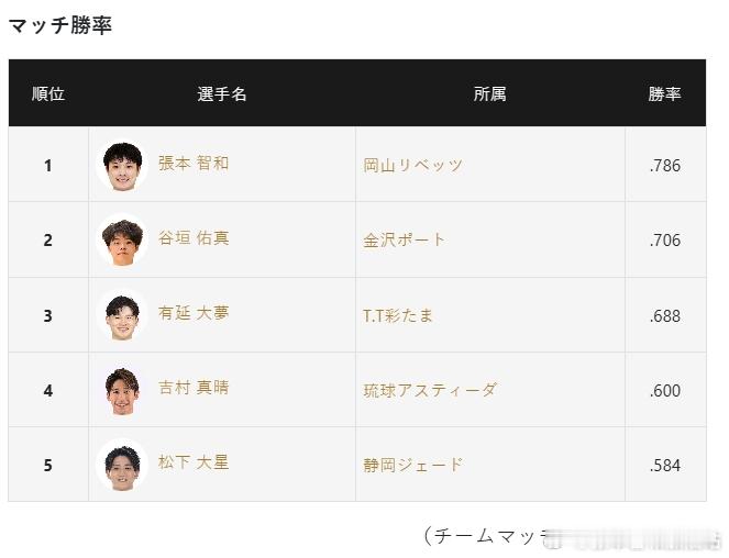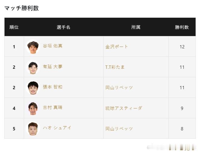 日本乒乓球t联赛张本智和 上周末(20日,21日)的比赛结束后,冈山队18战9胜9负积28分排名第4,琉球队同为18战28分排名第5,TT彩玉17战33分,领先冈山5分排名第3。常规赛排名前三才能进入淘汰赛,冈山队的比赛还剩7场。张本智和20日战胜安宰贤后,个人胜场升至11场,落后胜12场的谷垣佑真一场排名第3;个人单打胜率仍为第一。