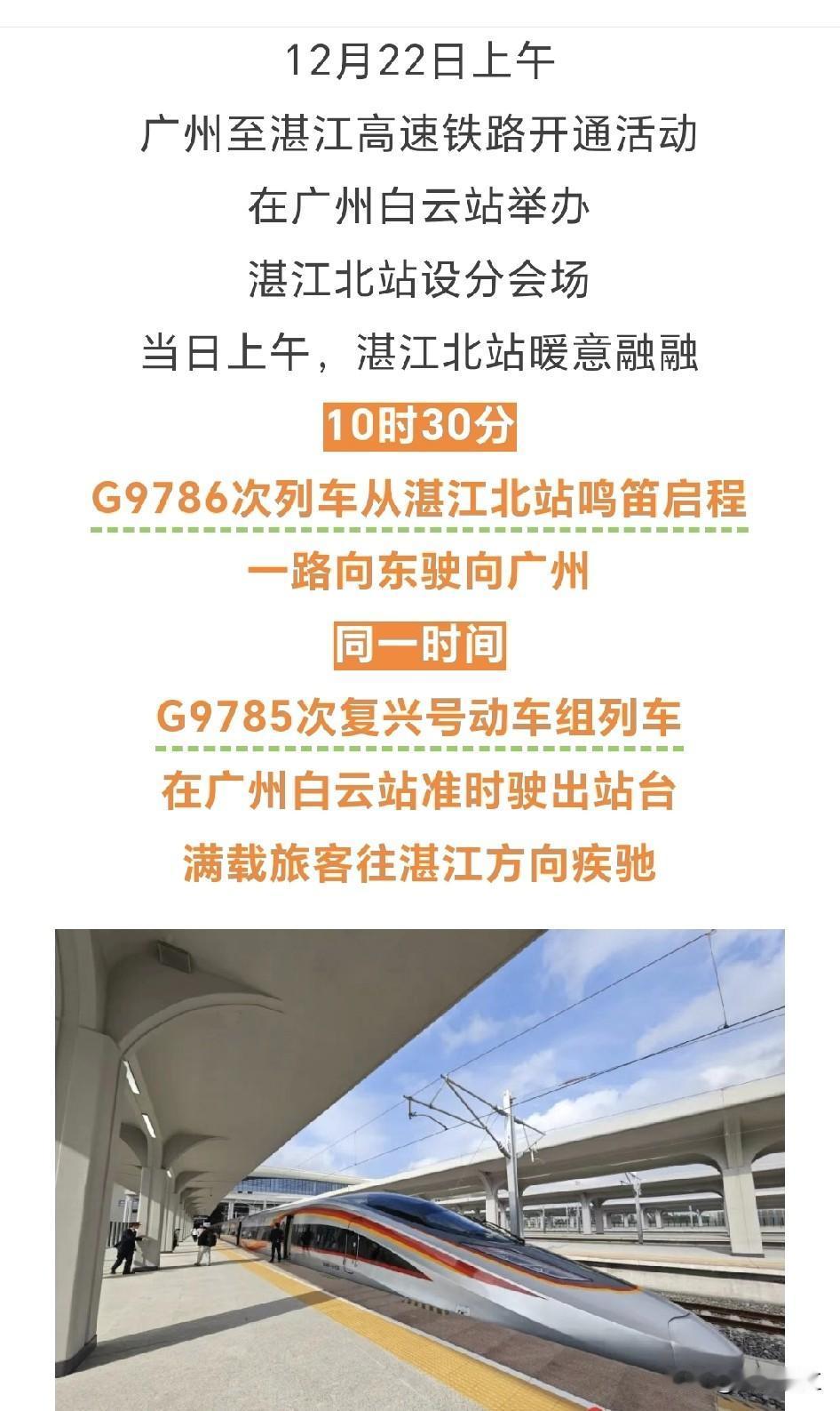 2025年12月22日,真是个好日子,广湛高铁正式建成通行啦。这样的大事件,作为湛江本地的正能量的主流自媒体,《情怀湛江》当然要记录一下。 不得不说,广湛高铁的建设真的很顺利!从湛江湾海底隧道的开挖,经历一个一个阶段的标志性工程项目进度,一个一个候车站的建成,到湛江北站的完美收官,现在广湛高铁终于正式通车了!可喜可贺啊! 广湛高铁通行,粤西地区的湛江和茂名的市民是最大的受益者!这两地都是广东省的人口大市,也是省内外出务工人员最多的地级市。广湛高铁让粤西地区的湛江和茂名更快融入大湾区的经济发展之中,来自这两地的旅客肯定是广湛高铁的主要客源,以后得到更便捷更高质量的交通出行服务,大大提高了幸福感!当然,以后如果能够与时俱进地调低票价,这种幸福感就更高了!