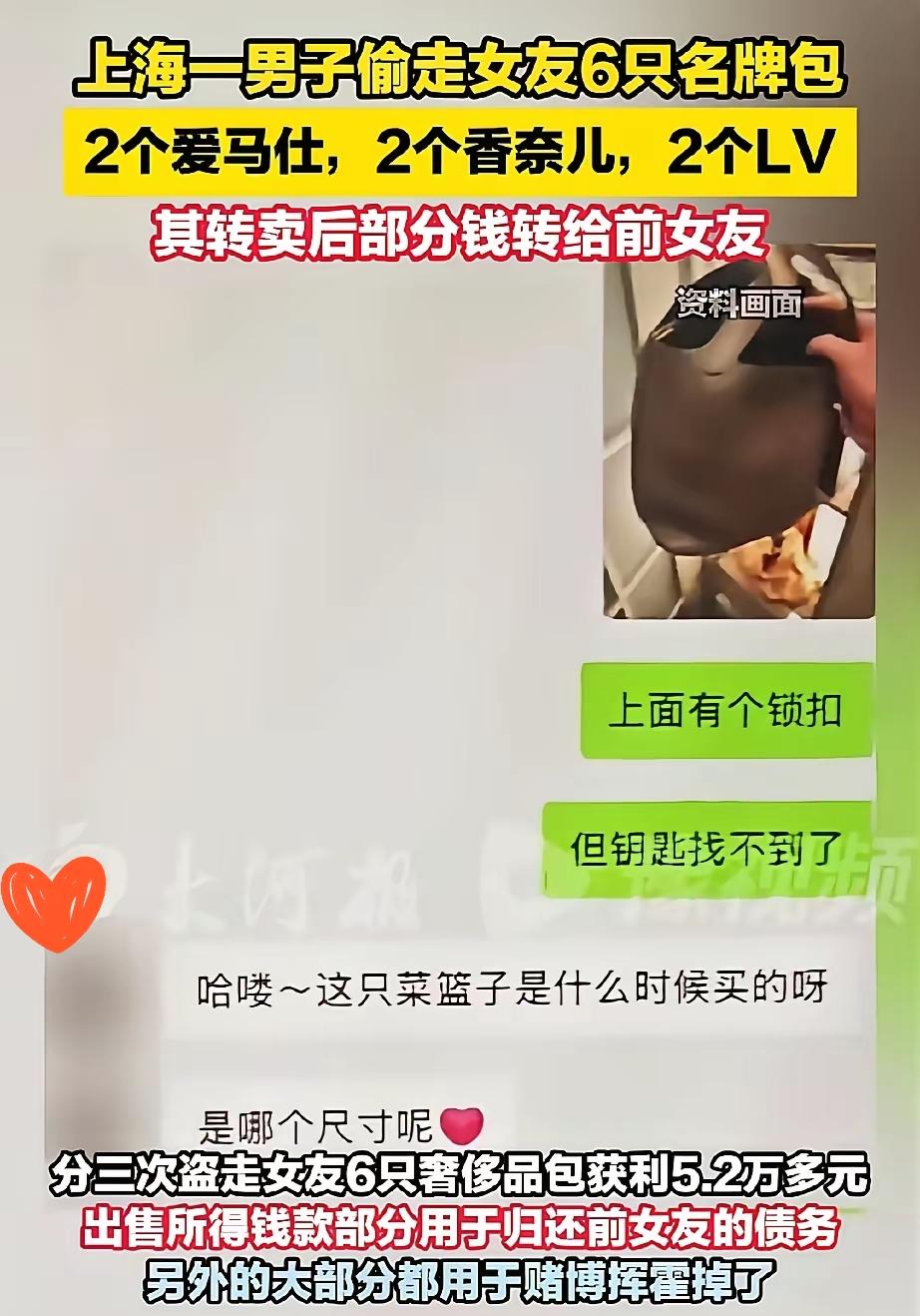 卖现任女友的包,养前女友?上海这男的操作真绝了! 上海一男子胆大包天,居然把现任女友的六个名牌包偷偷摸走变卖,揣着5.2万赃款转头就给前女友转了过去!现女友平时不常背这些包,直到收拾衣柜才发现宝贝包包集体“失踪”,吓得赶紧报警。 警察一查小区监控,好家伙,这男的凌晨跟做贼似的,三番五次进出女友家,每次离开背包都鼓得像座小山。被传唤后他倒是坦白得很,承认就是瞅准女友不常用包、家里没人的时候下的手。 一边花着现任的钱,一边补贴前女友,这哪是谈恋爱,分明是把现任当提款机!真应了那句话,人品不过关,再甜的情话都是扯淡。这男的不仅背叛感情,还触碰法律红线,拘留判刑都是他自找的。 姐妹们,找对象到底是先看真心还是先看条件?遇到这种吃里扒外的人,你们会怎么处理?