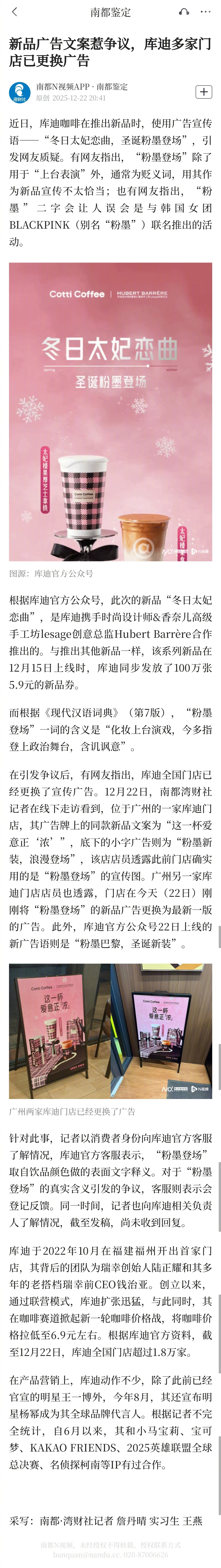 #库迪广告文案被指有贬义#【新品广告文案惹争议,库迪多家门店已更换广告】#库迪门店更换争议广告文案#近日,库迪咖啡在推出新品时,使用广告宣传语——“冬日太妃恋曲,圣诞粉墨登场”,引发网友质疑。有网友指出,“粉墨登场”除了用于“上台表演”外,通常为贬义词,用其作为新品宣传不太恰当;也有网友指出,“粉墨”二字会让人误会是与韩国女团BLACKPINK(别名“粉墨”)联名推出的活动。根据库迪官方公众号,此次的新品“冬日太妃恋曲”,是库迪携手时尚设计师&香奈儿高级手工坊lesage创意总监Hubert Barrère合作推出的。与推出其他新品一样,该系列新品在12月15日上线时,库迪同步发放了100万张5.9元的新品券。而根据《现代汉语词典》(第7版),“粉墨登场”一词的含义是“化妆上台演戏,今多指登上政治舞台,含讥讽意”。在引发争议后,有网友指出,库迪全国门店已经更换了宣传广告。12月22日,南都湾财社记者在线下走访看到,位于广州的一家库迪门店,其广告牌上的同款新品文案为“这一杯爱意正‘浓’”,底下的小字广告则为“粉墨新装,浪漫登场”,该店店员透露此前门店确实用的是“粉墨登场”的宣传图。广州另一家库迪门店店员也透露,门店在今天(22日)刚刚将“粉墨登场”的新品广告更换为最新一版的广告。此外,库迪官方公众号22日上线的新广告语则是“粉墨巴黎,圣诞新装”。针对此事,记者以消费者身份向库迪官方客服了解情况,库迪官方客服表示,“粉墨登场”取自饮品颜色做的表面文字释义。对于“粉墨登场”的真实含义引发的争议,客服则表示会登记反馈。同一时间,记者也向库迪相关负责人了解情况,截至发稿,尚未收到回复。