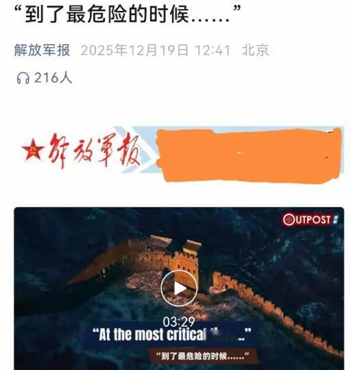 这个信号不简单——做最坏准备! 12月19日,军报平台发布消息,只有短短几个字:“到了最危险的时候......”! 说白了,军报这句“到了最危险的时候……”就是给全体中国人敲的警钟,提醒我们内外隐患已到临界点,唯有凝聚一心清内忧、定外患才能安然过关。 可能有人觉得,不就是一句简短的警示吗?至于这么当回事?那是没琢磨透这几个字背后的分量。 熟悉历史的都知道,“中华民族到了最危险的时候”这句话,最早来自《义勇军进行曲》,当年是在1933年长城抗战的炮火里催生出来的,背后是山河破碎、国破家亡的危急关头,每一个字都浸着血泪。 现在军报重新提起这句,绝不是随便感慨,而是把当前的处境摆到了明面上,相当于直接告诉大家:必须收起侥幸心理,准备应对最坏的情况了。 2025年这一年,说是二战后全球不太平的顶峰之一都不过分,到处都在打,欧洲的俄乌冲突拖到第四年还没停,中东的巴以冲突直接扩散到也门、黎巴嫩,连美国都下场跟以色列一起炸伊朗。 非洲的苏丹危机死了上万人,拉美那边美国又搞起了所谓的“禁毒战争”,以往平静的地方全乱了套。 而且现在打仗早就不只是枪炮相向了,2025年9月欧洲好几个机场都被网络攻击瘫痪,航班全乱了,能源、医疗这些关乎民生的关键设施,都成了攻击目标。连人工智能都被扯进了乱局,深度伪造、智能网络诈骗越来越难防,损失比以前大得多。 在这种乱糟糟的大环境里,咱们作为世界第二大经济体,自然成了某些国家的眼中钉。美国2025年12月发布的国家安全战略报告,直接把咱们当成“近乎对等的竞争者”,表面上说要稳定关系,背地里小动作没停。 贸易上搞关税战,还逼着企业把产业链迁回美国或者所谓的“友好国家”,就想跟咱们脱钩断链;科技上卡脖子更狠,对半导体硬件出口管得更严,还想方设法阻止咱们参与人工智能的标准制定,生怕咱们赶上来。 周边也不省心,台海、南海那边总有人来滋扰,个别国家还拉拢小圈子搞排他性联盟,把军备部署到咱们家门口,就是想搅乱咱们的发展环境。 外部乱成一锅粥,咱们内部也不是一点问题没有。现在经济回升的基础还不牢,一些关键核心技术还攥在别人手里,想升级高端制造还得闯好几关。而且非传统安全风险也越来越多,极端天气、公共卫生事件这些都得提防,就连海外的项目和人员安全都面临现实威胁。 更别说还有“台独”“藏独”“东突”这些分裂势力在外面蹦跶,总想找机会搞破坏,这些都是咱们必须清理的内忧。 把这些事儿串起来看,军报的警示就再清楚不过了。不是在制造焦虑,而是把现实摆出来:现在的处境,就是内外风险凑到了一起,到了不能再掉以轻心的临界点。以前咱们总说和平发展,不是说和平是天上掉下来的,而是靠自己硬实力守来的。 2025年中美贸易战里,咱们能跟美国对等反制还拿到有利结果,就是因为这些年发展攒下了底气。 放到现在这个节骨眼上,团结就是最硬的底气。以前长城抗战的时候,就是靠全民族拧成一股绳,才把亡国灭种的风险挡了回去;现在也一样,外部越施压,内部越要齐心。 不管是搞经济建设、攻克技术难关,还是防范各种风险,只要14亿人攥成拳头,就没有迈不过去的坎。那些想趁机捣乱的势力,最怕的就是咱们团结一心,毕竟他们能搞破坏,却挡不住一个国家向上走的势头。 所以别把这句警示当成空话,它更像是一份动员令。告诉咱们别再抱有幻想,该清醒了,该发力了。把自己的日子过好,把自己的事做好,内部少些内耗,外部硬起腰杆,不管是外部的围堵还是内部的隐患,都能一一化解。 毕竟,真正的安全感,从来不是别人给的,而是靠自己人拧成一股绳,踏踏实实干出来的。