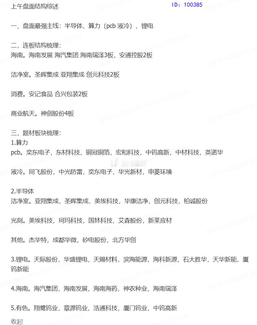 超级大放送!干货满满!【午盘回顾】 早盘指数延续反弹维持强势震荡,短线情绪稍微偏弱,已经连续两个交易日弱于指数了,市场风格切换的预明持续加强,昨天还有点没法判断切换的节点,今天看下来大概率就在周四或者周五的样子。 板块方面,情緒端的几个方向都延续了分化走势。昨天最强的海南早盘没有换手标的晋级低于预期,田野股份给出的套利空间太小了,板块下午还有一次回流的机会但很有难度,感觉这个方向被量化资金定性了,典型的先手收劑后手。 商业航天昨天说过兑现压力会非常大,产业能接受前几次的回收失败但短线热钱和量化资金无法接受,主要还是和位置有关系,不过产业趋势还是相对明确的,预计不会跌太久就会有资金抄底。而且商业航天不是纯情绪方向,后面风格切换的时候反倒有穿越的预期。 消费同样分化,资金围绕强势股抱团为主,东百集团是典型的妖服走法,同时福建板块也是一个不可或缺的属性,实际上风格切換的节点就是看福建板块的结束时间,走一步看一步。指数端主要还是靠泛科技带队走强,其次就是涨价的有色。泛科技方面中芯国际、寒武纪等科技权面轮番表现,当然对于热钱来说重点还是算力硬件,明年M9材料和液冷是主要增量,M9材料这块重点说的钻针和树脂都已经新高,电子布和HMVLP4、5也在新高的路上。液冷目前算是相对低位,除了英维克之外基本都还是一个刚止跌的状态。有色方面鸨、锡、锂钴、镍、黄金以及白银是关汪焦点。【王点公司跟踪】N纳百川:公司长期深耕热管理领域,是国内最早布局新能源汽车热管理的企业之一,也是首批与宁德时代合作开发电池液冷板产品的供应商之一,现已在新能源汽车动力电池液冷板领域占据较高地位,公司积极开展機向及纵向拓展,以动力电池液冷板向储能电池液冷板衍生,并以单一液冷板产品向箱体集成和CTP技术路线演进。储能方面公司是宁德时代、阳光电源、海辰储能等国内头部新能源电源没备厂商的供应商,对于较为前卫的CTB/CTC电池技术路线,公司已实现为国内首款CTC技术路线新能源汽车零跑C01及后续C11型号的冲压式液冷板产品开发。可以说公司基本盘非常稳定。电池液冷板和数据中心液冷是“技术同源、应用分叉”的兄弟关系。它们共享液冷技术的核心“骨架“和「器官”,但针对各自服务的”身体”(电池包 vs. 服务器)的不同“生理需求”(安全均温 vs.极限散热),进化出了不同的 外型“和”功能重点”。除了技术迁移之外,供应链如铝材、钎焊、流道加工、泵、阀门、换热器等供应商高度重合,热管理工程师、流体工程师等专业人才可以在两个领域间流动。纳百川在液冷板领域(如控温、轻量化)拥有超过200项专利,这构成了跨领域发展的潜在技术储备,关键是下游客户也会倒逼公司去推进数据中心液冷。一旦进军数据中心液冷领域,凭借过硬的技术储备及良好的客户基础,公司有望快速打开第二增长曲线。