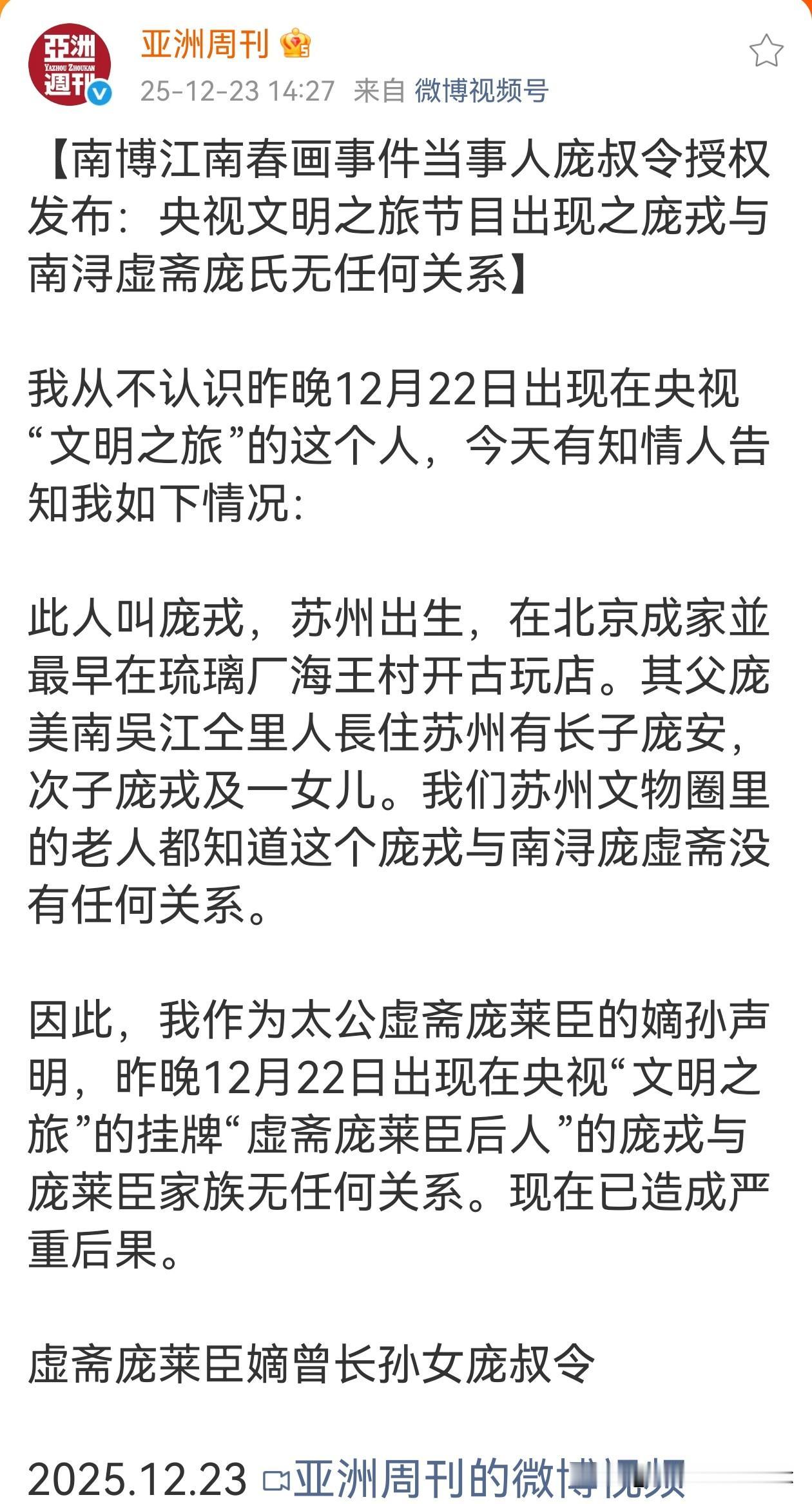 庞家后人一直在打假中, 前有徐莺,又来个庞戎, 庞叔令授权《亚洲周刊》发布:刘芳菲在直播间采访的庞莱臣后人庞戎与南浔虚斋庞氏无任何关系。 12月22日晚上,刘芳菲在直播间采访了庞氏后人庞戎,讲述家族旧事,没想到,这个庞戎也是个“假后人”。 值得注意的是,刘芳菲早已不是央视的主持人,在2023年6月的时候就已经离职,她现在属于一个自媒体人,而她的节目叫《芳菲的文明之旅》。 庞叔令已明确表示不认识庞戎这个人,他与南浔庞虚斋和庞莱臣家族也无任何关系。 这个世界真是个草台班子,一个假后人徐莺还不够,还来个庞戎,庞家后人也真是太忙了,不仅忙着找丢失的旧藏,还要忙着打假庞氏后人。 刘芳菲也没有调查清楚就开始蹭热度,庞戎不是真孙子,却要装孙子。 庞戎 庞叔令 南京博物院
