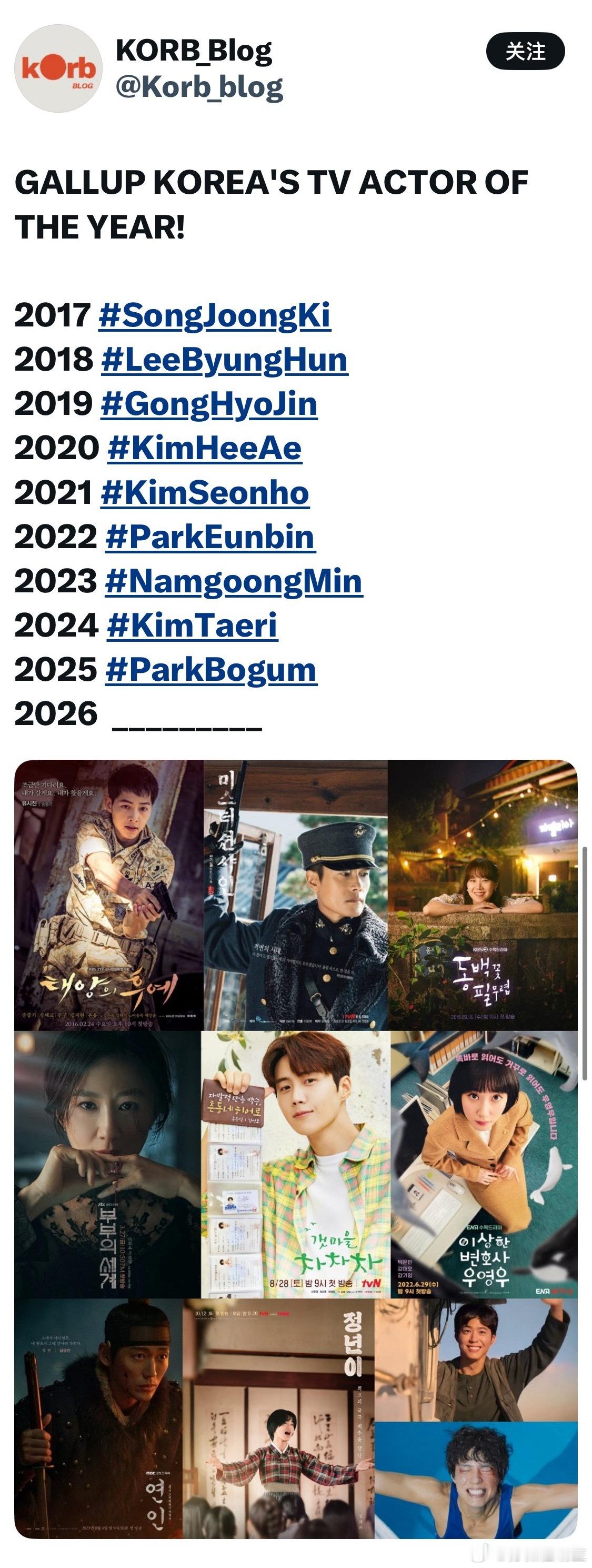 盖洛普韩国年度最佳韩剧演员一位总结2017 宋仲基 2018 李秉宪2019 孔晓振 2020 金喜爱2021 金宣虎 2022 朴恩斌2023 南宫珉 2024 金泰梨2025 朴宝剑 (2016)