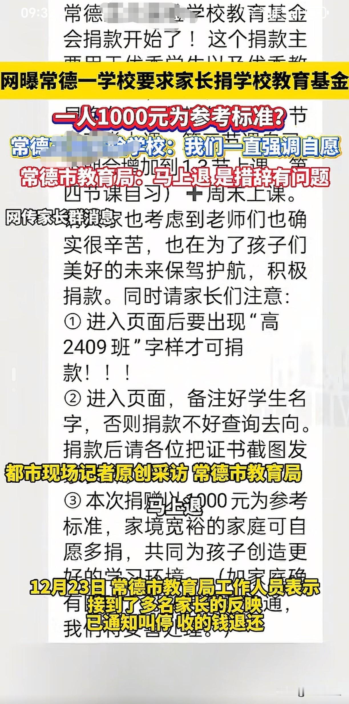 记得之前我那个时候上学,学校根本没有这么多事情。现在有的学校哪里像是教书育人的地方,倒是越来越像一门生意了。 刚看到一新闻报道,湖南常德某学校老师在群里发通知,要求学生家长向学校捐“教育基金”,明确表示每个人捐款不能少于1000元,家里条件好的可多捐,可分几次捐款。并称这笔捐款将用于晚自习的开支、学生相关支出及一些优秀师生的奖励。 让人不舒服的是,甚至捐款的金额都要扯上“985”“211”,把家长对孩子的期盼变成赤裸裸的数字暗示。完全就是把家长当成现成的提款机。 事情曝光之后,学校借口说全凭家长自愿,没有强制要求。可明眼人都清楚,不捐的话,后面自己的的孩子在学校肯定会被穿小鞋。 学校该做的应该是好好教学,而不是整天琢磨着怎么从家长口袋里“化缘”。这次是叫停了,可这种变相收费的“歪脑筋”不从根上拔除,下次还会换个花样再来。