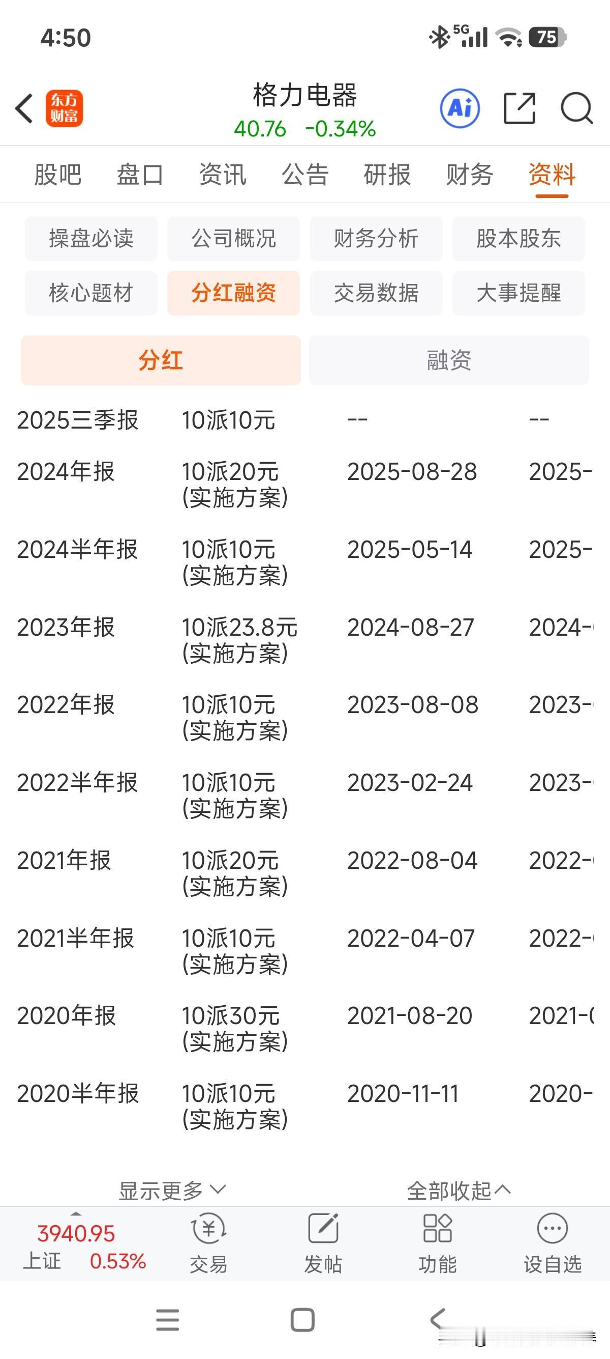 分红公告应该快来了,还记得去年是年末最后一天公告中期分红公告,后面拖到5月14日才发放!今年发放时间预计提前4个月! 虽然个人也持有格力,但佩服那些单吊格力电器的投资者,格力估值一直属于迷一样的存在,8倍不到的市盈率,7%以上的股息率!但估值低不是没理由的! 要说是成长股吧,业绩几年没突破!要说是红利股吧,股息率是挺好的,但股息发放时间跟股份支付率都是开盲盒[捂脸]!不少公司已经发布未来三年投资者回报规划!格力电器啥时候也去抄个作业?