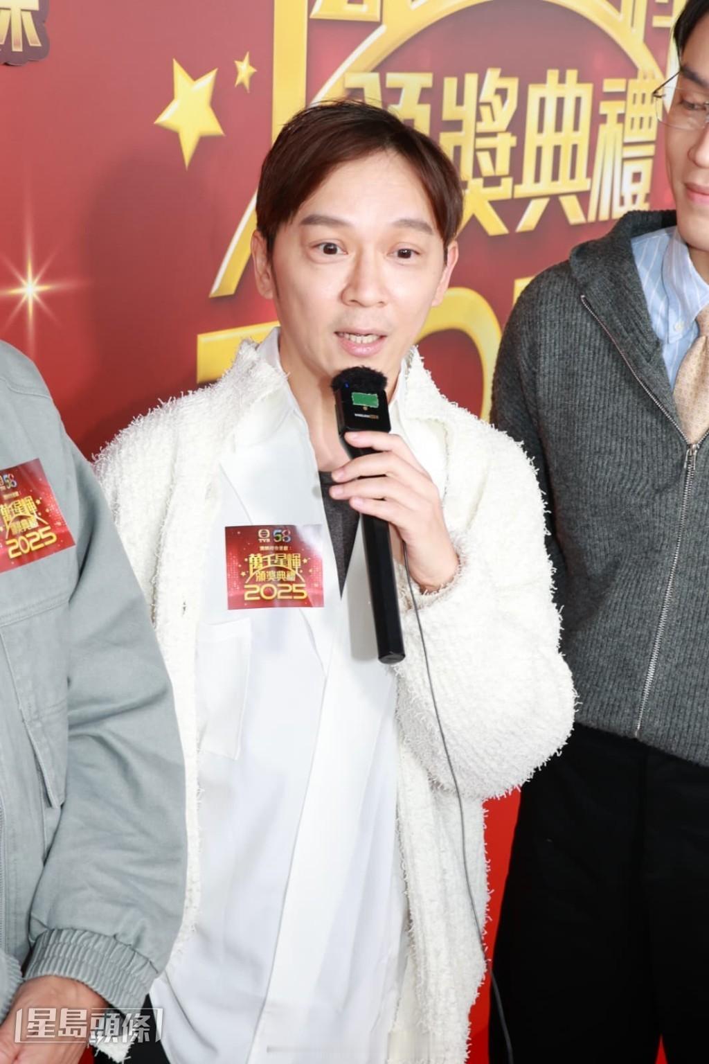 星岛:万千星辉颁奖典礼2025丨邓智坚盼凭“飞爷”夺男配 何广沛志在参与为大家打气 丁子朗认曾被经理人问感情事入围《万千星辉颁奖典礼2025》“最佳男配角”十强的何广沛、邓智坚、丁子朗及徐荣今日(23日)于电视城会见传媒,凭《新闻女王2》获提名的何广沛指只要《新闻女王2》、《金式森林》成员得奖就会开心,颁奖礼当晚旨在帮大家打气,徐荣就坦言有心愿,希望在得到30年金牌的同时,有一个奖放在旁边,当成是一种留念。邓智坚再成为大热人选之一曾得过“男配”的邓智坚(飞爷)今次再成为大热人选之一,他坦言破纪录也好,也是一个话题:“落场跑都希望有奖,上一季飞爷是五强,但没拿到,戏里面都有颁奖礼,飞爷都有提名,但剧情没交代有没有拿,所以无论戏内戏外,飞爷都是想拿一次!”他指若获奖是代表整个团队的创作,问到是否有压力?他坦言没有,因能进十强已经不简单,若然入五强就已平了第一季纪录,夺奖就破纪录。至于凭《侠医》奸角入围的丁子朗笑言本来有信心,但听完三位前辈的说话后,虽然对自己仍有信心,但认为三人亦很值得得奖,能够站在三位旁边一起受访已算是有交代,他亦指观众记得他剧中的坏人角色已是一种成就,若得奖当然是锦上添花,也希望下年有更多人可以找他做坏人,而身为过来人的徐荣亦坦言做反派有更多发挥机会。丁子朗曾表示会秀肌肉拉票,他笑言下星期会贴露身材相拉票。丁子朗未听过“禁爱令”对于《东周刊》爆TVB正严厉执行“禁爱令”,禁止力捧中的花旦与小生将感情事公开,丁子朗表示没有听过,但经理人同事有时也会问自己的感情生活史:“但问完之后都是说小心点看着啦。”虽然他不知“禁爱令”是否倒退的现象,但认为有机会是想令艺人更专注自己的事业。他又认为现在的观众很开明,就像何广沛结婚一样,大家也会替他开心。