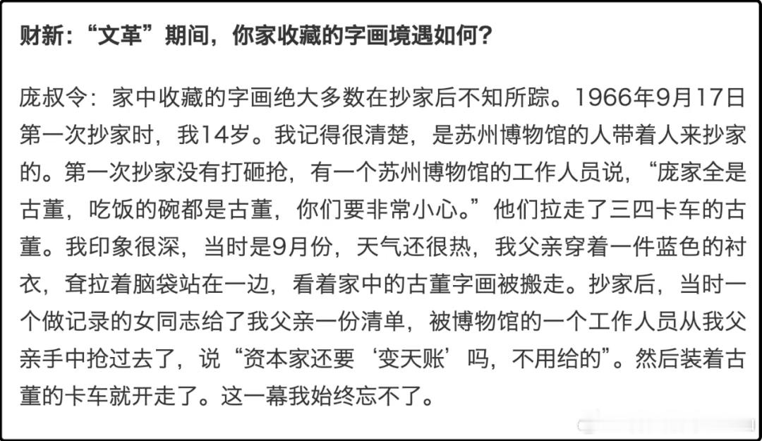 《财新》昨天报道的对庞莱臣后人庞叔令的采访“口头承诺,以后庞家后人要考大学,国家可以照顾。”“庞家我这一代四姐妹没有一个读大学的。”“抄家后,当时一个做记录的女同志给了我父亲一份清单,被博物馆的一个工作人员从我父亲手中抢过去了”