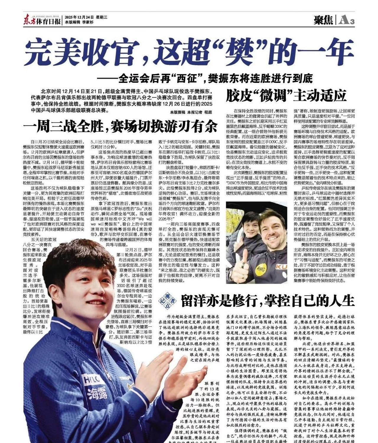 媒体真给力:超樊的一年,超级金满贯,中国乒乓球队现役选手樊振东! 12月24日,东方体育日报整版刊登樊振东“西战”战绩,无懈可击! 作为超级金满贯得主,樊振东在德甲赛场的稳定发挥,恰恰证明了他远赴欧洲打球并非是逃避竞争,他每走一步都是经过深思熟虑的。 此前,他退出世界排名,再到后来加盟德甲的一系列决定,曾引起外界的不解甚至武断揣测。可樊振东用行动证明他的选择是正确的,而且他还强调,只要国家需要他,他随时都可以为国家队效力! 樊振东效力的萨尔布吕肯现在的成绩稳居德甲前列,而他这段时间四战全胜的表现,正是球队稳居积分榜上游的核心支柱。这份亮眼成绩单,与他在乒超联赛创下的13连胜,全运会赛场10连胜的统治力一脉相承。 退出世排一年的樊振东实力不减,他还是原来的他!