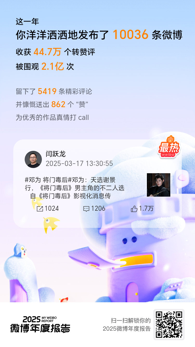 微博年度报告 实力这一块,咱确实拿捏了!2025年稳稳保持橙V身份313天!相逢的意义在于彼此照亮,这份成绩单离不开你们一直以来的支持和陪伴!你的专属年度播报也已生成,速来>>2025微博年度报告 围观!微博之夜