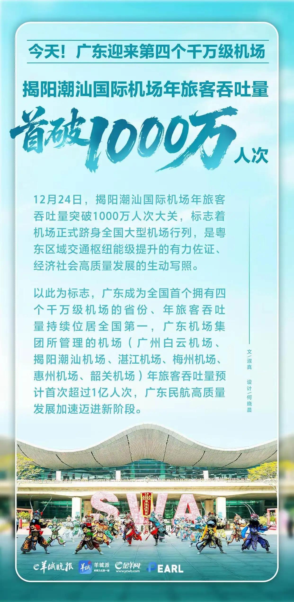 广东省揭阳市喜事连连。 揭阳机场旅客入揭客流吞吐量突破1000万人次并跨进全国大