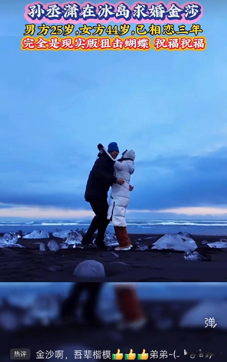 孙丞潇求婚金莎成功 孙丞潇在冰岛求婚金莎成功,两人紧紧拥抱在一起 孙丞潇25岁,金莎44岁,两人已经相恋三年,曾携孙丞潇参加综艺的金莎,这一段恋情从开始就备受质疑 如今,两人的爱情幸福稳定,是妥妥的现实版的《狙击蝴蝶》,祝福祝福