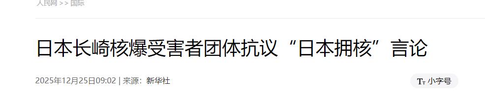 一旦日本宣布放弃“无核三原则”,并且把自己制造核弹列为国家目标,那我们一再引以为豪的核威慑还有意义吗? 说实话,以日本人的尿性,真的会这么干,既然已经有了拥核这样想法,势必会不顾一切,不择手段也要去达成目标。 2025年行将收尾,日本一份记录闭门讨论“拥有核武器”的会议纪要意外曝光,这种直接触碰核禁忌的行为,极具破坏性。 以高市早苗为首的日本政府,正在加紧推进安全法规修改,这种政策转向也是有切实的民意基础支撑。 2025年11月的民调数据显示,支持日本拥核的民众比例已攀升至41%,而就在三年前,这一数字还处于极低水平。 背后不难发现,官方一直在刻意渲染外部生存危机,引导社会情绪。 从技术层面看,日本早已具备拥核的潜在能力。截至2023年,其境内已囤积47吨分离钚。依托现有的工业体系,日本完全有能力快速制造出大量核弹头。 直白讲,日本与核大国之间的距离,只差一个政治决策。有分析认为,这种从技术储备到实际拥核的转化周期,可能缩短至半年。 这种“即时拥核”的能力,让日本此前坚守的“不引进、不制造核武器”的原则失去了可信度。 现任政府正试图修改这一过往承诺,本质上就是在通过分阶段推进,制造既成事实。他们的算盘很明确,就是用这种渐进式的试探,测试国际社会的忍耐极限。 但必须认清的是,拥核根本无法让日本获得真正的安全感。一旦撕毁核不扩散条约,日本将彻底失去“核受害国”的特殊身份,直接站到地区对抗的最前沿。 更严重的是,这会引发东亚地区无止境的军备竞赛,让日本本土陷入巨大的安全风险之中。 一旦日本拥核,极有可能成为冲突中的首选清除目标。这种代价,关乎整个民族的生存。 目前,日本主流媒体已对此表达了深度担忧。事实很清楚,试图用极端武力换取生存空间,最终只会走进死胡同,反而会增加被先发制人打击的可能性。 周边国家绝不会对日本的核动向坐视不管,历史上以色列曾为保障自身安全,对邻国的核设施发动致命打击,这种军事策略被称为“贝京主义”。 日本若执意推进核化进程,必然会触碰相关国家的战略红线,引发不可预知的后果。 阻止日本拥核,是关乎地区各国生存的底线问题。周边核大国不可能仅靠外交手段解决这一危机,极限施压下,甚至可能诱发大规模军事行动。 我们必须清醒地认识到,和平从不是理所当然。日本当下的一系列行径,是一场输不起的冒险。 核武器的存在意义,就在于它永远不能被使用。可当有人试图借助核武器获取政治利益、寻求所谓“解放”时,就会很危险。希望所有人都能保持警惕,守住来之不易的和平。 信息来源:《日本长崎核爆受害者团体抗议“日本拥核”言论》,新华社,2025年12月25日。