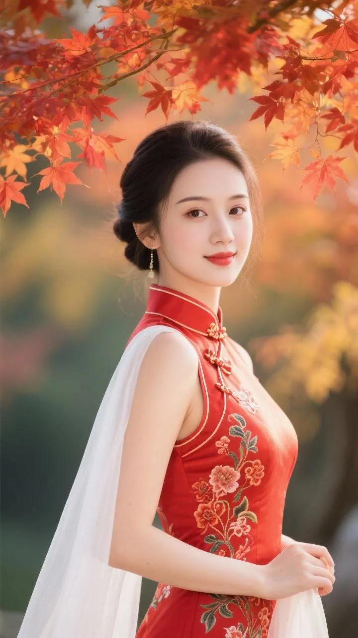 红白相间的旗袍,搭配精致的盘发和花饰,尽显东方古典美!