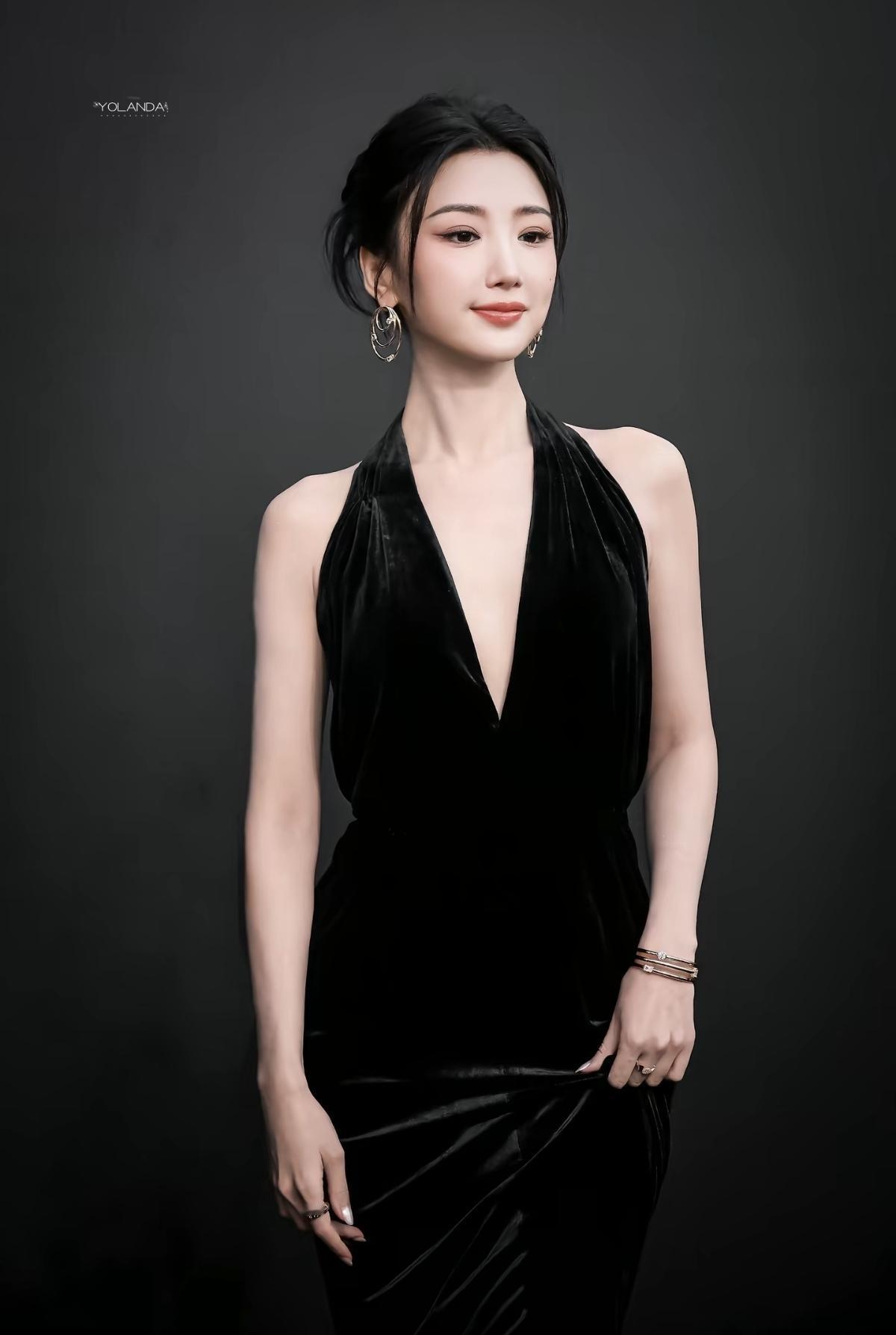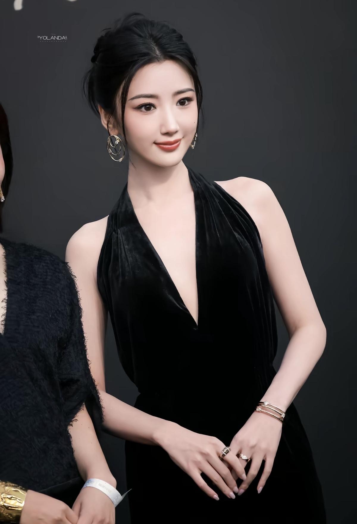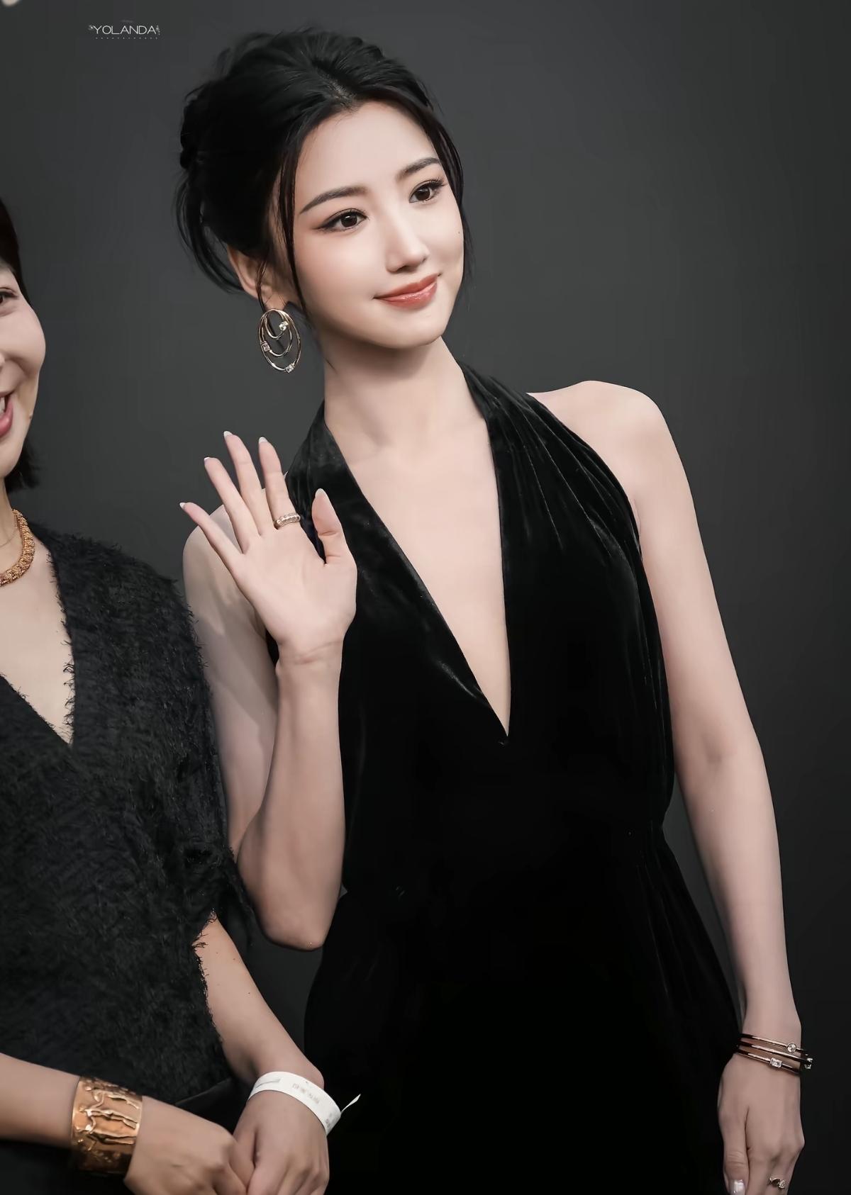 黑色挂脖礼裙剪裁利落,衬得毛晓彤身姿窈窕,自带清冷贵气,站在那里就是自带聚光灯的