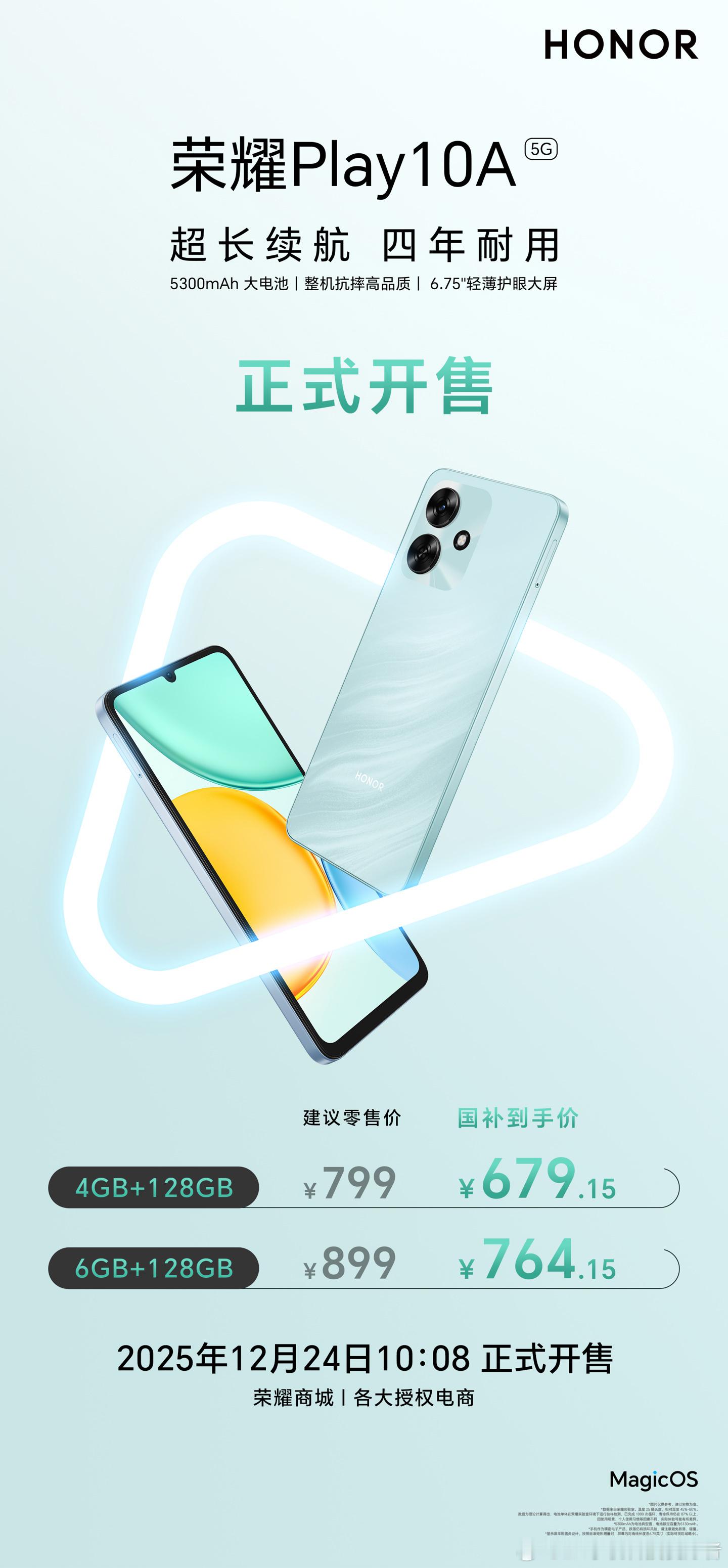 荣耀Play 10A开售,4GB+128GB售价799元;6GB+128GB售价899元。百元低端机,没想到还有水滴屏,这个价格可还行?