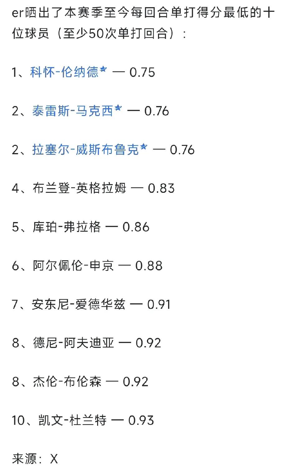 本赛季联盟每回合单打得分,联盟倒数前十:清一色的巨星,其中小卡位列倒数第一,马克西威少紧随其次,并列倒数第二。此外进入榜单的,还有今年的状元弗拉格火箭的申金和森林狼的爱德华兹尼克斯的布伦森等人。 杜兰特太意外了,曾经的单打高手立棍,单打的代表人物,竟然排联盟倒数第十。