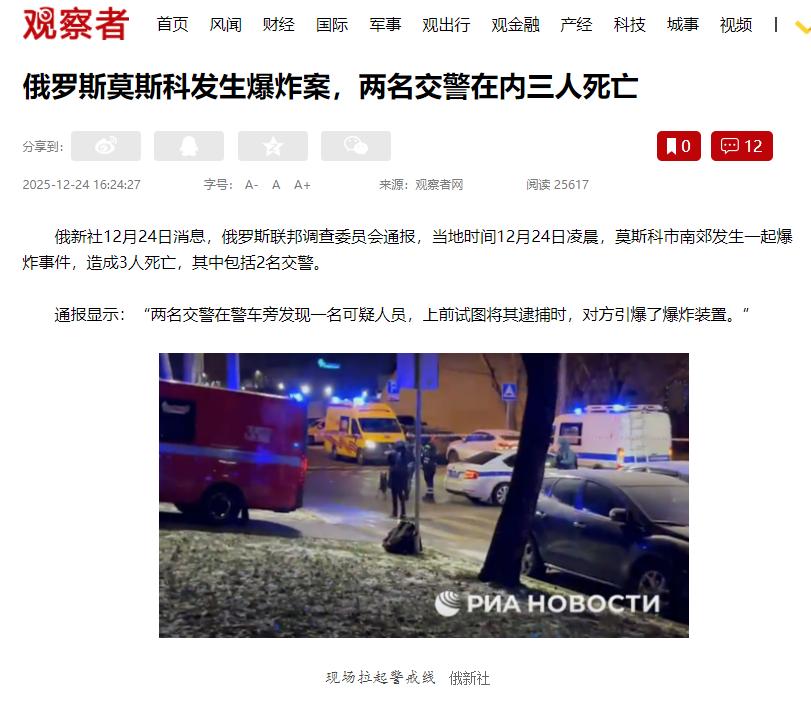 乌克兰的势力已经大批渗透进了莫斯科? 12月24号凌晨,莫斯科南郊一声巨响,打破了城市的平静,也毁了三个家庭。有两个年轻交警,24岁的伊利亚和25岁的马克西姆,发现一个可疑的人,上前想盘问抓捕,结果对方直接引爆了炸弹。两个交警当场就没了,连嫌疑人在内一共死了三个人。 最让人揪心的是,马克西姆刚结婚没多久,家里还有个9个月大的小闺女,这孩子以后再也见不着爸爸了。 这事儿肯定不是意外,也不像是简单的刑事案件,让人不得不怀疑这背后和乌克兰势力有关,但现在凶手还没抓到,只能说是合理怀疑,毕竟没实锤。 可能有人会问,就这一起爆炸案,凭啥怀疑乌克兰啊?其实不是瞎猜,看看最近莫斯科发生的事儿就知道了。这起交警遇袭案,顶多是近期一系列袭击的冰山一角。 就在爆炸前两天,12月22号早上,俄罗斯一位叫萨尔瓦罗夫的中将,在莫斯科南边的停车场上车时,车底盘下的炸弹突然炸了,这位将军伤得太重没救过来。 现场乱得很,他的车被炸烂,周围七辆车都受了牵连,碎片到处都是。俄罗斯调查部门已经把怀疑目标对准了乌克兰情报部门,这也不是空穴来风,之前就有过类似的案子。 近一年多来,莫斯科和俄罗斯境内针对高官、执法人员的袭击就没断过。 2024年12月,俄军一位叫基里洛夫的中将,在自家公寓楼外被电动滑板车上的炸弹炸死,事后乌克兰安全局还跳出来说这事儿是他们干的。 2025年4月,另一位莫斯卡利克中将也在莫斯科郊外被汽车炸弹炸死。这两起案子和这次萨尔瓦罗夫中将遇袭的手法都差不多,都是偷偷装炸弹、精准找目标,难免让人怀疑是同一伙人干的。 而且莫斯卡利克那起案子已经破了,凶手是个乌克兰特工,2023年就被派来莫斯科潜伏,混了一年才动手,把将军的作息摸得一清二楚。有这个先例在,现在怀疑乌克兰势力渗透进了莫斯科,就很合理了。 有人可能又会问,之前都炸高官,这次怎么盯上普通交警了?这恰恰让人更担心,说明搞事的人可能已经渗透得很厉害了,就是想制造恐慌,让莫斯科老百姓和执法人员都提心吊胆。 交警是城市安全的第一道岗,炸他们就是挑衅执法的权威,破坏治安。而且这次的嫌疑人带着能直接引爆的炸弹,明显是有备而来,大概率是背后有人指使。 结合之前的案子,自然会怀疑是乌克兰情报网络安插的人。现在俄检方已经立案侦查了,具体是谁干的还得等调查结果。 再说说数据,更能看出情况不简单。自从2022年俄乌冲突开始,俄罗斯境内已经有好几位俄军将领在后方被炸死了,光2024年12月到2025年12月这一年,就有三位中将在莫斯科周边遇袭丧命,这在以前是从来没有过的。 这些将领的安保级别都很高,能精准找到他们的行踪、成功暗杀,没有强大的情报网络根本做不到。 而且这些身经百战的将领,很可能就是某些势力重点针对的目标,目的就是削弱俄军指挥能力,打击老百姓的士气。 除了炸高官,莫斯科还发生过好几起疑似破坏活动。2025年12月1号,一天之内两起汽车爆炸,虽然最后定了意外,但结合当时的局势,很难不让人怀疑是有人在试探安保漏洞。 12月15号,俄罗斯安全部门一下子抓了十个嫌疑人,说他们被乌克兰情报人员收买,准备炸变电站、烧火车,这说明搞事的可能已经形成了网络。 而且之前还有乌克兰特工潜入俄罗斯军用机场,烧了两架战机,12分钟就撤离干净,可见训练得很专业。 为啥怀疑乌克兰势力能渗透进来?大概率是他们用了“藏起来+找内应”的办法。 像之前那个乌克兰特工,伪装成普通人在莫斯科潜伏很久;还会用金钱收买俄罗斯本地人帮忙,这些本地人熟悉环境,不容易被发现。 而且冬天前线打仗不那么激烈的时候,后方的袭击就变多了,这次12月短短24天就好几起爆炸,正好对上这个规律。 他们大概是正面战场打不过,就转到后方搞偷袭,制造恐慌给西方看,好要更多援助。 再回到这起交警遇袭案,两个年轻人只是尽职责盘查可疑人员,就丢了性命,伊利亚入职才一年多,马克西姆的孩子还那么小,想想就让人心疼又生气。 这事儿再次提醒大家,莫斯科可能已经被外部势力渗透了,而且他们的目标不再局限于高官,开始针对普通执法人员,这已经突破底线了。 他们在俄罗斯心脏地带搞恐怖活动,就是想破坏稳定、打击民心。相信随着调查深入,背后的势力早晚能查到,但不管怎样,逝去的生命再也回不来了,这就是战争带来的悲剧。