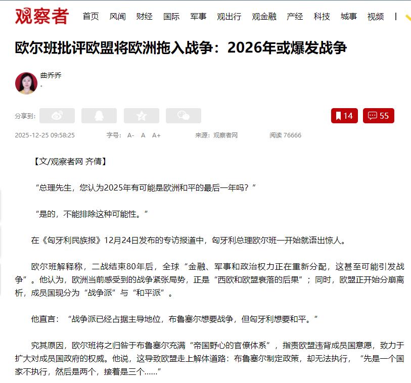 匈牙利总统欧尔班直言:2025年或许是欧洲和平的最后一年,2026年或将爆发战争!在《匈牙利民族报》12月24日的专访中,匈牙利总理欧尔班一开场就抛出惊人观点,称不排除2025年成为欧洲和平最后一年的可能。他解释道,二战结束已80年,当前全球的金融、军事和政治权力正在重新分配,这种变动很可能引发战争。 欧洲如今的局势之所以如此紧张,根源在于西欧和欧盟的衰落;而且欧盟内部已经分裂,形成了主张战争与倡导和平的两派。 欧尔班明确表示,主张战争的一派已经占据上风,布鲁塞尔方面倾向于战争,而匈牙利则坚定追求和平。 他还指出,这一切的问题都出在布鲁塞尔那些当官的身上,他们野心太大,根本不把成员国的意愿放在眼里,一心只想把权力都攥在自己手里。 这话听着吓人,但欧洲最近的所作所为,说明根本不是瞎咋呼。布鲁塞尔那些人嘴上喊着和平,干的全是把欧洲往战火里推的事,尤其是一个劲地给乌克兰送钱送武器,把整个欧洲的安全都搅乱了。 最近欧盟刚定下来,2026到2027年要给乌克兰900亿欧元贷款,说是帮乌克兰搞经济、养军队,说白了就是拿欧洲老百姓交的税,给战争续命。 要知道从2024年3月到现在,欧盟已经给乌克兰拨了268亿欧元,这些钱没一分用在改善欧洲人自己的生活上,全砸在战场上了。 更让人上火的是,这900亿欧元还是欧盟内部吵得不可开交,差点闹崩才定下来的。 27个成员国分成两派,德国、法国这些想打仗的,急着给乌克兰送钱送武器,逼着其他国家同意;匈牙利、捷克、斯洛伐克这些国家坚决反对,不想把自己国家拖进去。 就说比利时,有人想动冻结的俄罗斯资产给乌克兰凑钱,结果67%的比利时人都支持政府反对这事,首相硬顶着没松口。 最后欧盟没办法,只能联合借债打仗,这债最后还是得欧洲老百姓还。你说布鲁塞尔这些当官的,是不是根本不管老百姓的想法,一门心思要搞扩张、推战争? 不光如此,欧尔班说欧洲在搞军备竞赛,这话一点没掺假,现在欧洲各国的军费涨得离谱,完全是要打仗的架势。 有报告显示,2024年全球军费里,欧洲涨得最凶,除了马耳他,所有欧洲国家都在加军费,北约欧洲成员国的军费加起来都到4540亿美元了。 到了2025年更夸张,预计要突破5500亿美元。德国2025年军费涨到885亿美元,成了全球第四大军费国,还喊着要建欧洲最强常规军队。 波兰更狠,2025年军费占GDP快4.5%了,计划2026年提到5%,还让18到65岁的男性都去军训,想把军队从21万扩到30万,以后还要扩到50万。 这些国家不光加军费、扩军队,还疯狂买武器、建军工厂。波兰花65亿美元从韩国买坦克,还投钱建弹药厂,想把炮弹产量提4倍;英国要造12艘核潜艇,买7000枚远程导弹。 以前欧洲还能靠美国保安全,现在美国说不怎么管欧洲了,逼着欧洲自己扛,甚至威胁要撤军。欧洲本来就慌,再被布鲁塞尔想打仗的派带着搞军备竞赛,局势只能越来越紧张。 别以为这是为了防御,其实只会让冲突越来越厉害。就说俄乌冲突,欧盟一边倒地帮乌克兰,送武器送钱,本来还有谈判停火的可能,被他们这么一搅和,只能一直打下去。 现在欧洲能源涨价、生活成本变高,老百姓日子过得苦,布鲁塞尔那些人根本不管,眼里只有自己的野心。欧尔班想和平,但想打仗的派占了上风,只能被推着走。 说来说去,2026年可能爆发战争真不是欧尔班吓人,欧洲现在军费飙到冷战后最高,各国都在备战,欧盟还一个劲给战争输血,内部矛盾越来越深。 经历过二战的老人都知道战争有多惨,欧洲80年的和平要是被布鲁塞尔的错误政策毁了,真的太可惜了。希望欧洲能有人早点醒悟,不然到时候打仗,受苦的还是普通老百姓。