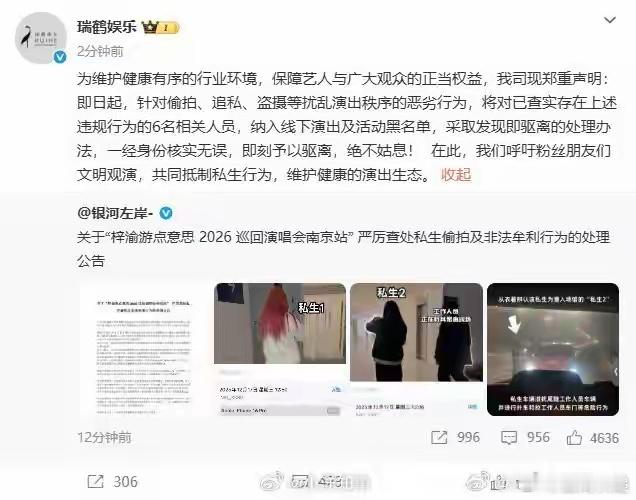 梓渝方曝6人私生团伙偷拍细节私生行为真的越界了!潜入彩排场馆偷拍牟利,还做出跟车、扑车、红灯拦车的危险举动,不仅侵犯艺人隐私,更直接威胁到人身安全。还好主办方和经纪公司果断采取黑名单机制,警方也已受理案件,希望能依法追责,让这些无视规则的私生付出代价,也给行业敲响警钟,坚决抵制私生乱象!梓渝 梓渝方曝6人私生团伙偷拍细节