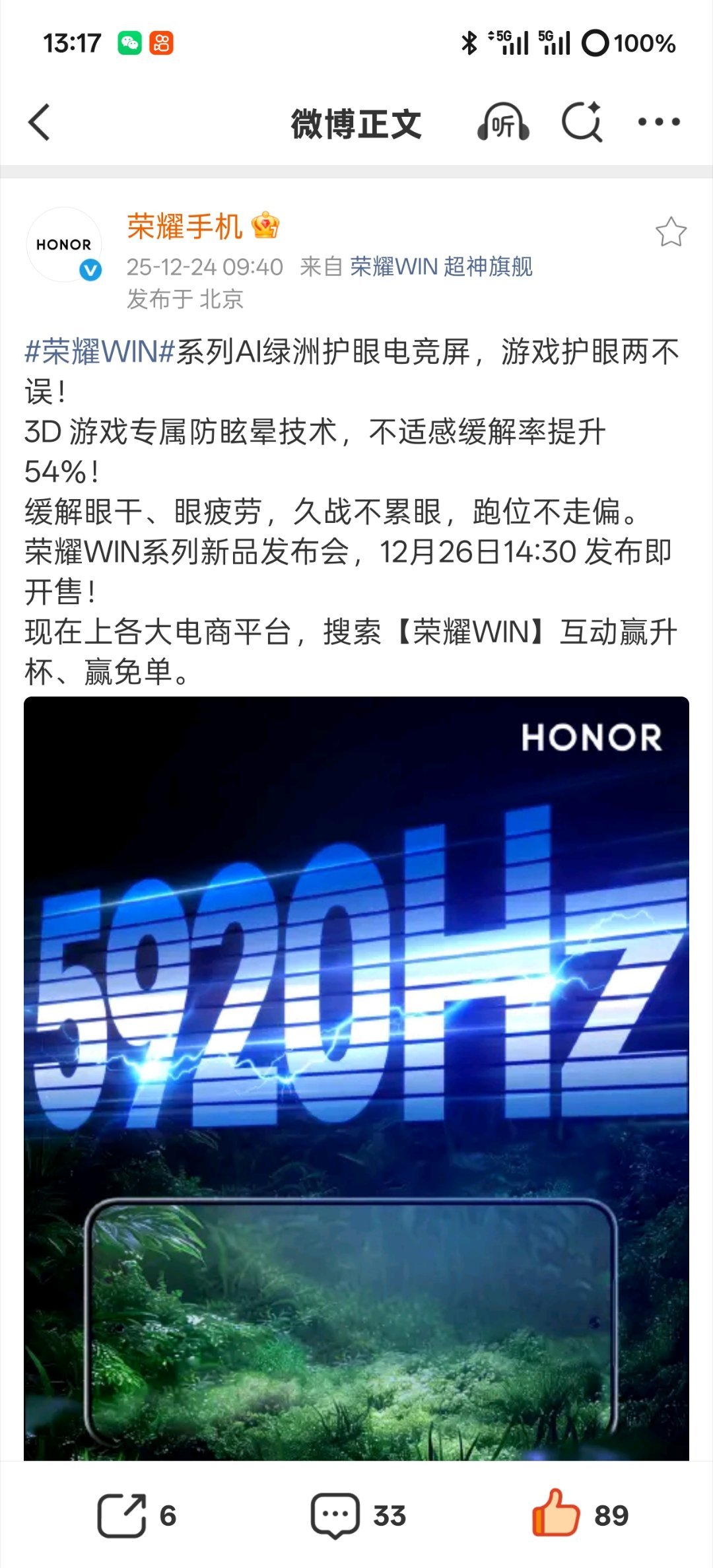 【荣耀WIN系列手机官宣支持3D游戏专属防眩晕技术】荣耀 WIN 将全系搭载 AI 绿洲护眼电竞屏,并支持 3D 游戏专属防眩晕技术,宣称“不适感缓解率提升 54%”。荣耀官方预热海报显示,荣耀 WIN 系列手机这块 AI 绿洲护眼电竞屏还支持行业最高 5920Hz 零风险 PWM 调光,并获最高等级德国莱茵全局护眼 5.0 认证,号称可缓解眼干、眼疲劳。荣耀已定档 12 月 26 日发布荣耀 WIN 系列两款新品 —— 荣耀 WIN(超级旗舰)和荣耀 WIN RT(标准旗舰),系列新机全系搭载 10000mAh 巨无霸青海湖大电池。根据目前已经掌握的消息,荣耀 WIN 将搭载第五代骁龙 8 至尊版旗舰芯片,配合 LPDDR5X 至尊版与 UFS 4.1。此外,系列新机还全系标配荣耀环绕低音炮 2.0(双 1216 对称扬声器),支持 IP68/69/69K 满级防尘防水。
