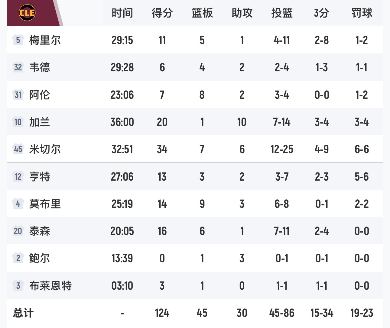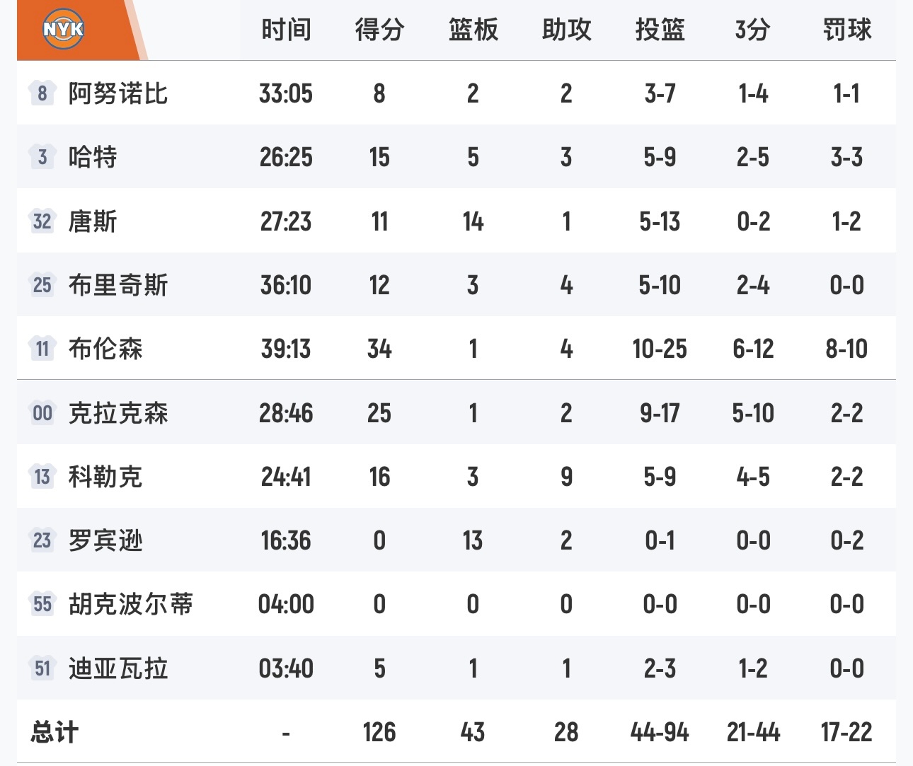 圣诞大战第一场,骑士在最多领先17分的情况下,客场124-126输给尼克斯,遭遇本赛季第15场失利。米切尔和布伦森各得34分。尼克斯替补克拉克森狂砍25分。
