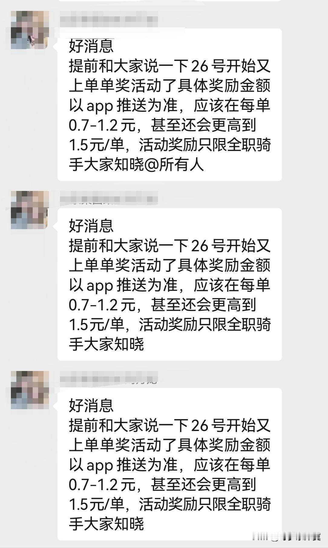 又要有活动了,从12月26号开始,站长在群里发的!一种可能,就是饿了么估计又要砸钱搞活动了! 因为最近连着几个月单量都少的可怜。不光是我们,还有美团,京东都没有单子! 还有一种可能,那就是冬天越来越冷,离过年也越来越近,不下血本搞活动,回头估计人都走光了! 毕竟重赏之下必有踏实勤奋的外卖员!要不到年根,谁还有心思跑外卖啊! 大家觉得呢?