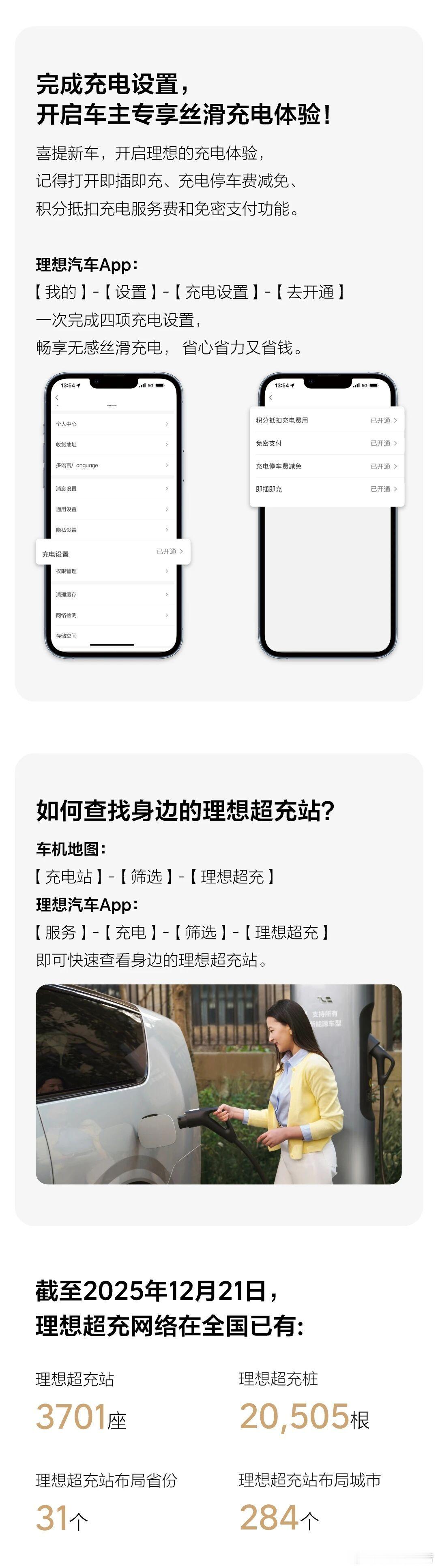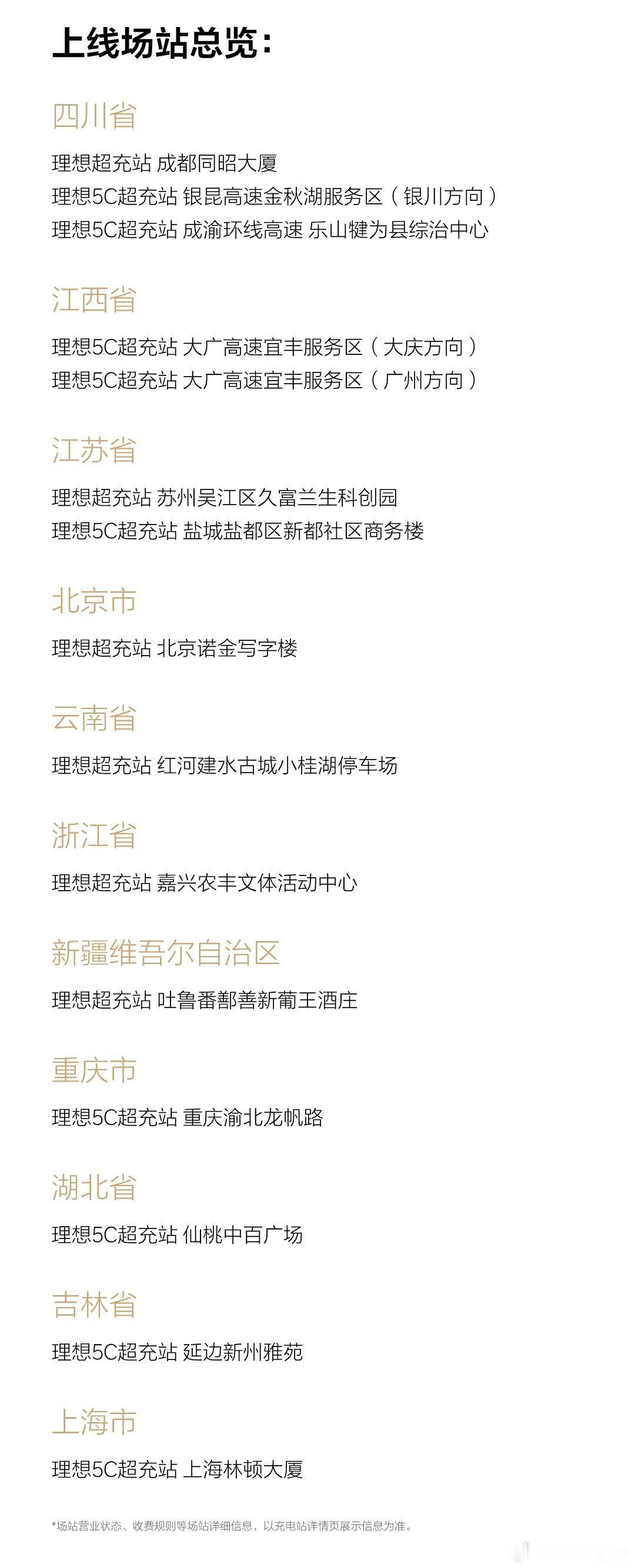 理想超充站累计上线数突破3700座2025年第51周上线15座理想超充站,累计上线数突破3700座!2025.12.15-12.21期间,总计有15座理想超充站投入运营,分别位于四川省、江西省、江苏省、北京市、云南省、浙江省、新疆维吾尔自治区、重庆市、湖北省、吉林省、上海市。理想超充网络覆盖城市持续扩张中,截至12月21日,理想超充已布局全国284个城市。汽场全开理想超充站累计上线数突破3700座理想超充站理想汽车