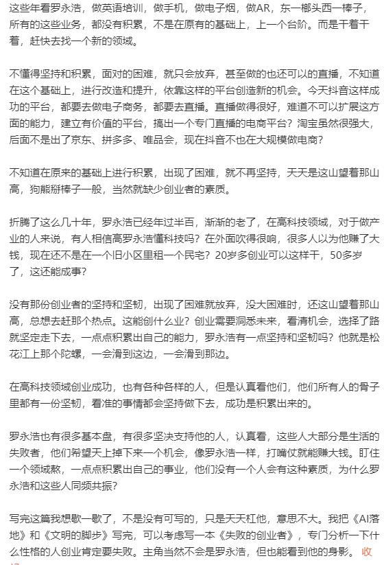 项立刚第八篇评罗永浩:称写完这篇不写了[抠鼻] 12 月 26 日,飞象网项立刚推出点评罗永浩的第八篇长文,并宣布这将是系列收尾之作。文中他将罗永浩创业未果的核心原因是缺乏坚持与韧性,全文未现新增信息量,流量表现也较此前明显下滑。 更引人争议的是,项立刚在文中直言罗永浩的核心支持者 “大部分是生活的失败者”。[紫薇别走] 项是真敢说啊,我都能想象到5 天后对其口诛笔伐的场景。