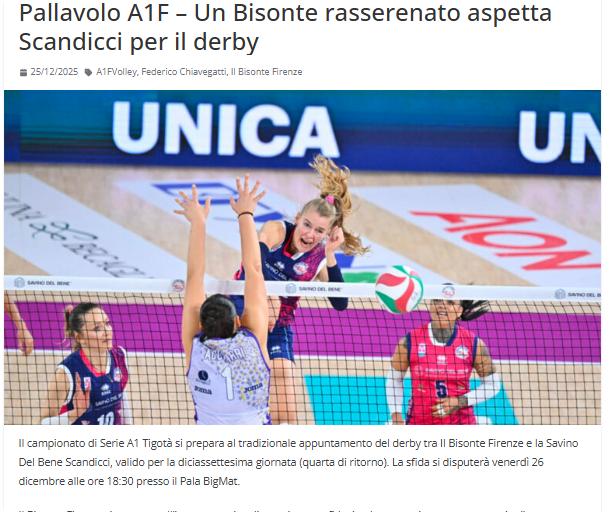 朱婷、庄宇珊的意甲 A1 圣诞节:佛罗伦萨"德比"时刻 意甲 A1 联赛即将迎来佛罗伦萨与斯坎迪奇之间的传统德比大战,这场比赛是第十七轮(下半程第四轮)的比赛。比赛将于 12 月 26 日星期五下午 6:30 在比格马特球场举行。 佛罗伦萨士气大振,此前她们刚刚在客场通过决胜局战胜了马切拉塔,结束了七连败的颓势。这场在丰特斯科德拉球场的胜利使主教练费德里科·基亚韦加蒂的球队积分上升至 15 分,以 5 胜 11 负的战绩位列积分榜第十,领先降级区 4 分。 斯坎迪奇状态正佳,此前她们在意甲联赛、欧冠联赛和世俱杯中取得了十二连胜。主教练马尔科·加斯帕里率领的球队目前以 40 分位列积分榜第二,刚刚以 3-0 战胜库内奥。 佛罗伦萨主教练费德里科·基亚韦加蒂就这场比赛发表了如下评论: "我们刚刚取得了一场意义重大的胜利,这对我们的积分榜和士气都至关重要。我们终于赢下了久违的一场胜利,首先我要祝贺q球员。对我们来说,这场德比战必须以轻松的心态来对待:对手是一支阵容强大的球队,正如她们最近赢得世俱杯冠军所展现的那样,我们必须像首回合那样正面迎战,给她们制造麻烦。我们的目标是头脑清醒地走上球场,充分发挥自身实力,首先享受比赛,然后尽可能给对手制造麻烦,争取取得好成绩"。