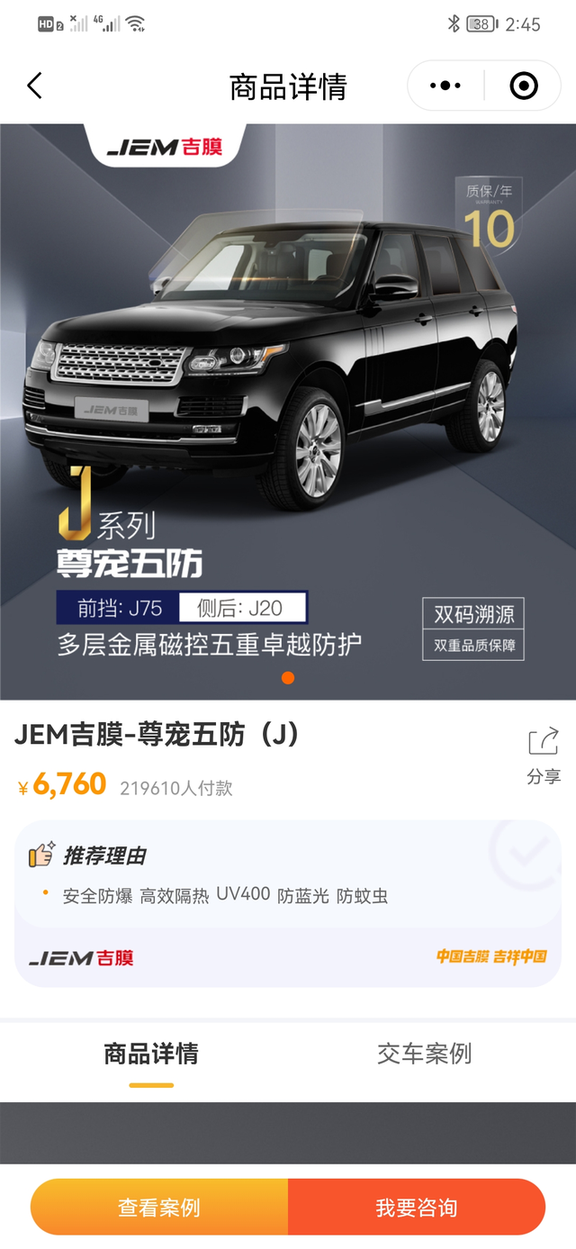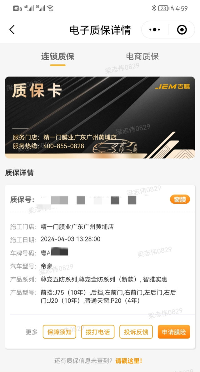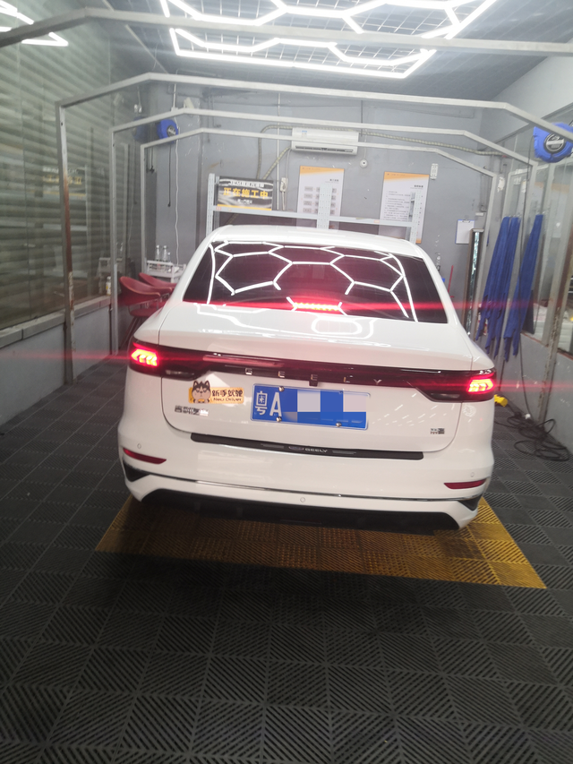 提车21天去贴膜了 刚上牌就打电话让我去贴4儿子的膜,但一直在忙就没去。看今天早上起来就拿起手机忙了一下工作后看时间差不多就出发了。去之前就猜到会推销加钱膜,结果也是完全猜中。推了4代5代车膜,但是服务态度还是很满意的,一边介绍一边一在强调你可以不加钱只贴4儿子送的膜。本来还想贴了送的膜顶一段时间等有空去朋友那重装一次3M的,朋友报价全车2000多,结果服务态度不错,上网找了下资料价格也没太夸大报价5680送十年膜险全国通用,就想试砍一下价行不行在说一砍就喔了在心里价位,在问问还有啥送?一开始说送一瓶浓缩玻璃水,后面加一个去甲醛(其实就是太便宜了看不上)我说这些都没啥用,后面她们开始耍无赖说把她们两美女送给我(我可不缺姑奶奶),最后磨了个全车镀晶。等待还是挺漫长的,介绍+谈价格就1个小时,洗车+贴膜又2小时,在一次洗车+镀晶又1个小时,做好车膜后现场灯照感受温度,紫外线测试,全部做完在交车。后面出来回公司又在外环堵车(45分钟车程开出了75分钟)。本次消费主要感觉很舒服才有后面的成交。