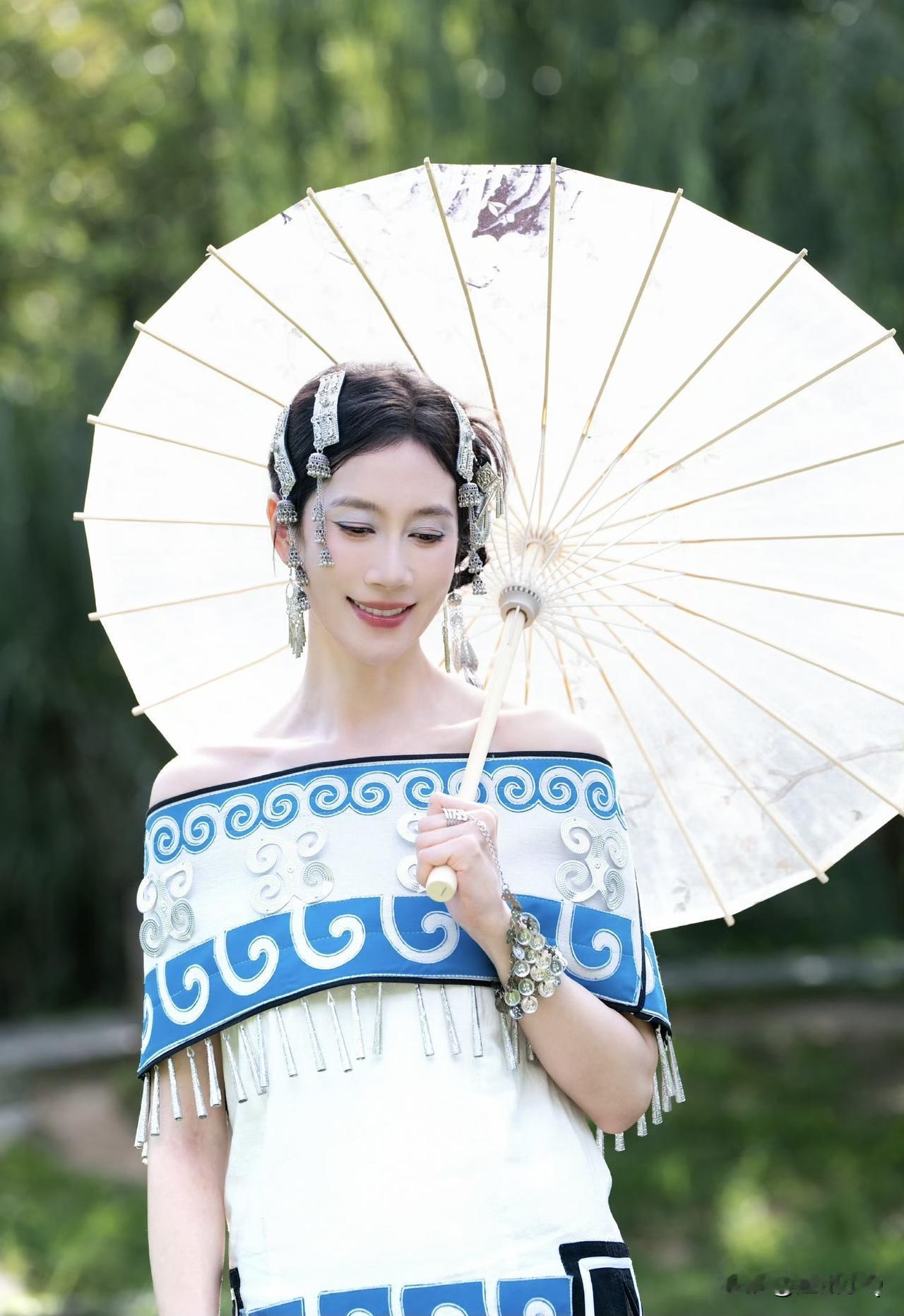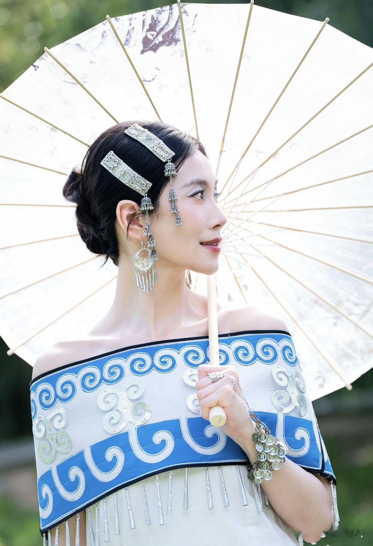 温峥嵘的骨相比较硬朗,所以面相偏男相。但她这身民族风打扮还是很成功的,整个人都变柔和温婉了,看起来也年轻不少。
