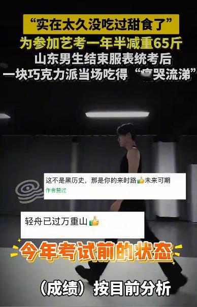 山东男生因为艺考减重65斤的事火上了热搜,视频里他捧着巧克力派边吃边抹眼泪,嘴里念叨着“太久没吃过甜食了”,这画面让不少网友直呼心疼又励志。这个身高187厘米的小伙子,入学时体重210斤,为了考上心仪的服装表演专业,硬是咬牙坚持了一年半,每天泡在健身房和操场上,连过年都只敢啃黄瓜。 艺考对形象的要求有多严格?拿服装表演专业来说,考生不仅要身高达标,体重、体脂率甚至走路姿态都得经过严格筛选。这位男生刚入学时,老师就明确告诉他:“现在这个体型,连初试都过不了。”这句话像根刺扎在他心里,第二天就开始制定减肥计划。每天清晨五点,当室友还在睡梦中时,他已经绕着操场跑了十圈;晚上别人在宿舍打游戏,他还在健身房举铁。最狠的时候,连续三个月每天只吃水煮鸡胸肉和西兰花,连食堂窗口飘来的炸鸡香味都得捂着鼻子绕道走。 这种近乎自虐的坚持,背后藏着艺考生不为人知的心酸。有位山西考生为了考音乐院校,半年减了47斤,每天训练三小时,过年时看着满桌年夜饭只能偷偷咽口水;还有女生为了练形体,大冬天穿着单薄练功服在走廊压腿,冻得膝盖发紫也不敢停。这些年轻人像被上了发条的机器,既要保持高强度训练,又要和食欲做斗争,稍有松懈就可能前功尽弃。 当统考结束的哨声响起,这位男生冲出考场的第一件事,就是跑到便利店买了块巧克力派。咬下第一口时,积压已久的情绪突然爆发这一年半里,他错过了所有朋友聚会,推掉了所有家庭聚餐,甚至因为低血糖在训练时晕倒过三次。此刻甜食带来的不仅是味蕾的满足,更像是对这段苦行僧生活的补偿。老师在一旁打趣:“使劲哭,哭完咱们去吃火锅!”这句话让现场气氛轻松起来,却也让更多人看到艺考生光鲜背后的真实。 不过医生提醒,长期极端节食可能带来健康隐患。有考生减肥后出现脱发、月经不调,甚至有人因为快速减重导致免疫力下降,考试前发烧住院。这位男生虽然成功减重,但后续仍需通过科学饮食和运动巩固成果。专家建议,艺考生可以制定分阶段目标,比如每周减重不超过1公斤,同时保证蛋白质和膳食纤维摄入,避免完全断糖。 这个视频之所以引发共鸣,是因为它戳中了无数年轻人的痛点为了梦想不得不压抑天性。但正如那位山西考生所说:“现在流的汗,都会变成未来舞台上的光。”当巧克力派的甜味在口中化开时,这个男生流的眼泪里,有辛苦,有释然,更有对未来的期待。毕竟,能为自己热爱的事情拼尽全力,本身就是件特别酷的事。 来源:潇湘晨报