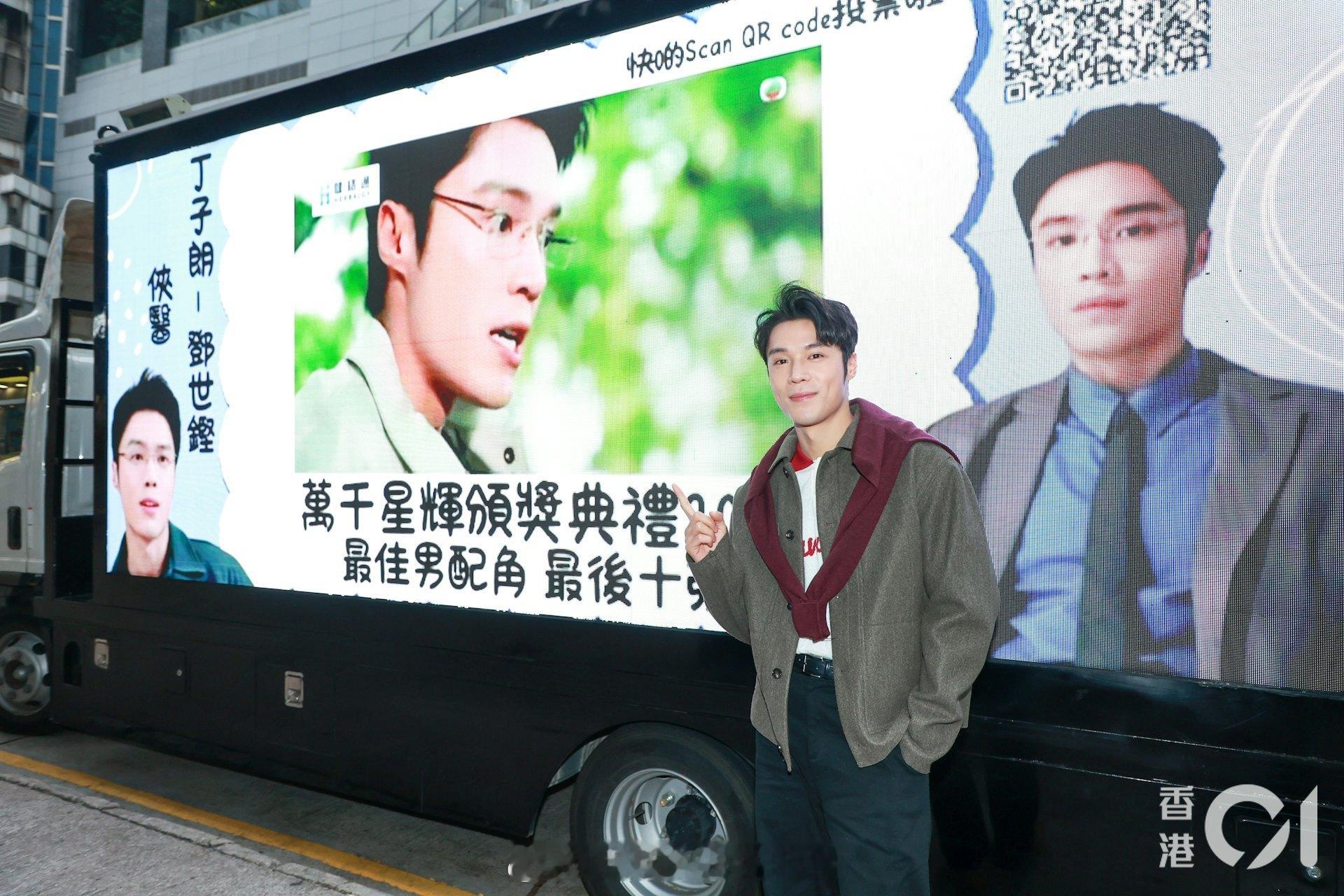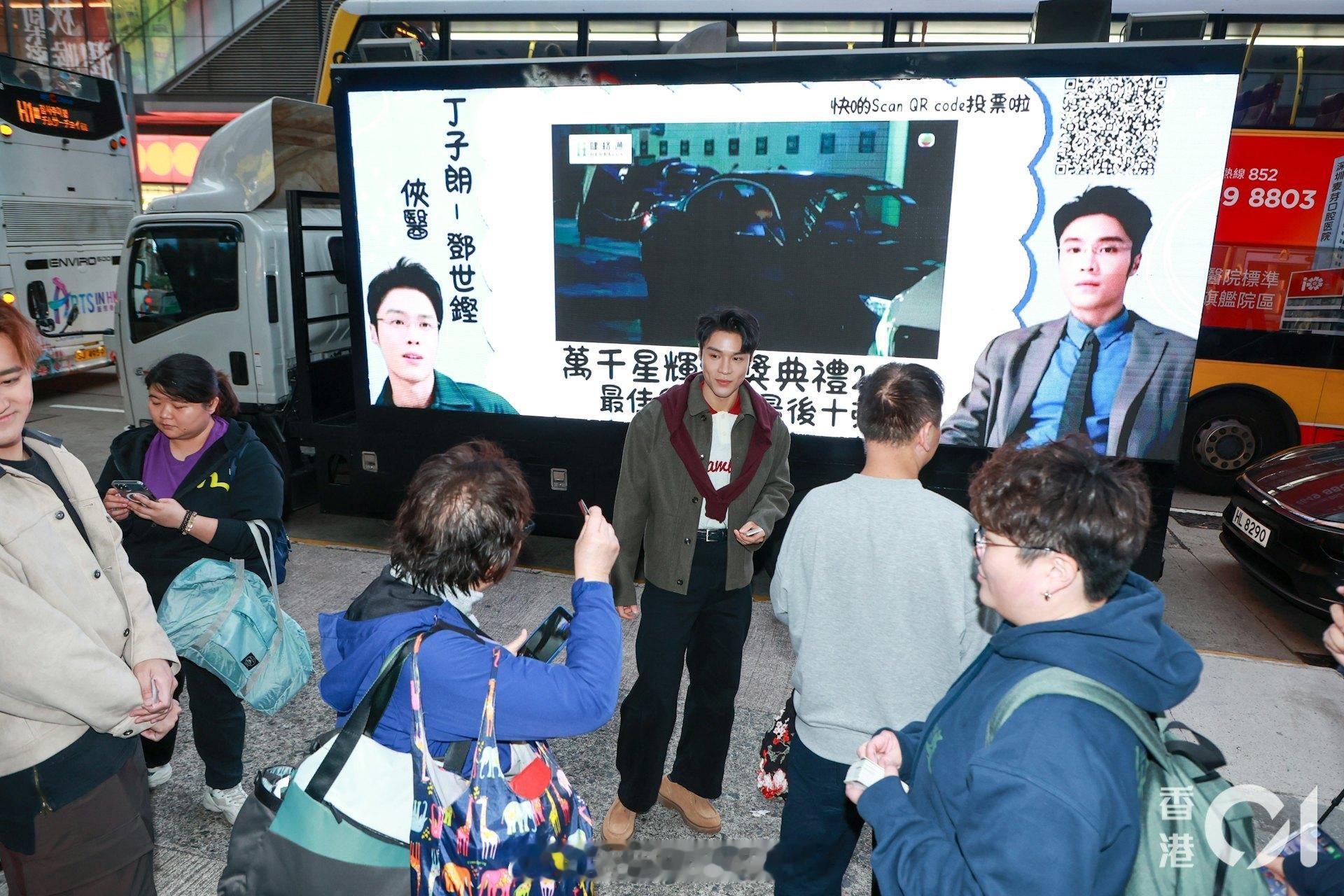 香港01:丁子朗圣诞节落闹市为男配角拉票出尽奇招:同大家自由拥抱昨日(25日)是圣诞节,不少艺人都选择陪家里人或者过二人世界,但入围《万千星辉颁奖典礼2025》“最佳男配角”十强的丁子朗就选择在这天出动拉票!他下午在铜锣湾街头进行拉票活动及与粉丝见个面,最惊喜的是现场有一辆大型“应援车”,不停循环播放他在剧集中的精华片段。丁子朗接受《香港01》访问时表示见到应援车后表现得既惊喜又尴尬,他笑言:“好神奇啊!首先我完全没想过,是一个好大的惊喜。我都是第一次见到,甚至有些受宠若惊,同埋有少少尴尬添。(为什么会觉得尴尬?)。因为在街上不停播着自己的片咯。可能其他人看返自己的剧都会有些尴尬,现在是在街上播自己的剧,还要叫大家看,我都有点惊的。”丁子朗被问到剧中最难忘是哪一个画面,他即笑指:“我想剪片那位一定系好有心思,特意剪了一些我不穿衣服的片段出来。我真是好惊,好尴尬。本身我都是一个比较外向的人,但见到这样即刻变成了一个‘内向的人’。”现场亦聚集了不少支持者,更有粉丝特意前来为他加油及投票。丁子朗透露31号会与粉丝一同倒数,更会现场献唱新歌:“因为大家听我做Show都是唱那几首歌,今次有新歌听,大家可以期待一下。”被问到会用甚么招数拉票时,丁子朗就大方表示:“我有想过送小礼物或者同大家自由拥抱,想给些温暖大家,大家记得投我一票呀!”见到丁子朗这么落力,看来对今年男配角一奖真是信心十足!