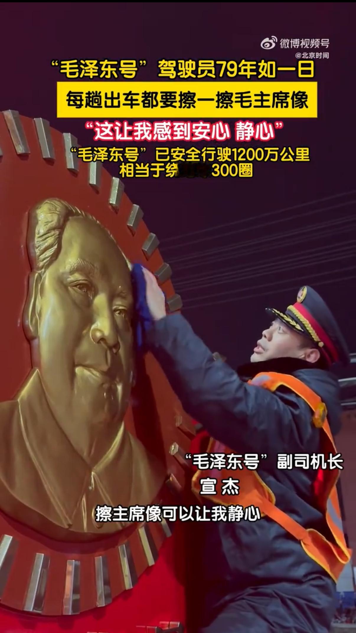 毛泽东号司机每天擦拭主席像 1946年诞生的“毛泽东号”,至今已安全跑超1200万公里。79年里换了189位司机,有个习惯始终没变——每天擦拭主席像。老司机说,这事儿就像给车“上发条”,擦一擦,心就静了。从战火年代到今天,这抹红色身影稳稳当当,连车组的小仪式都透着踏实劲儿。👍🏻👍🏻👍🏻