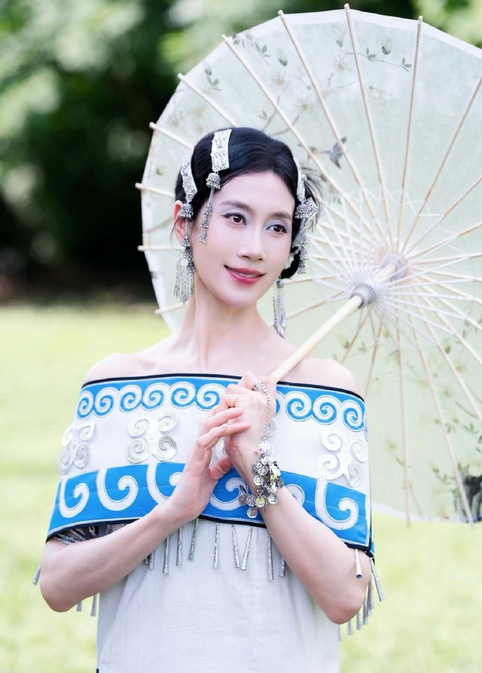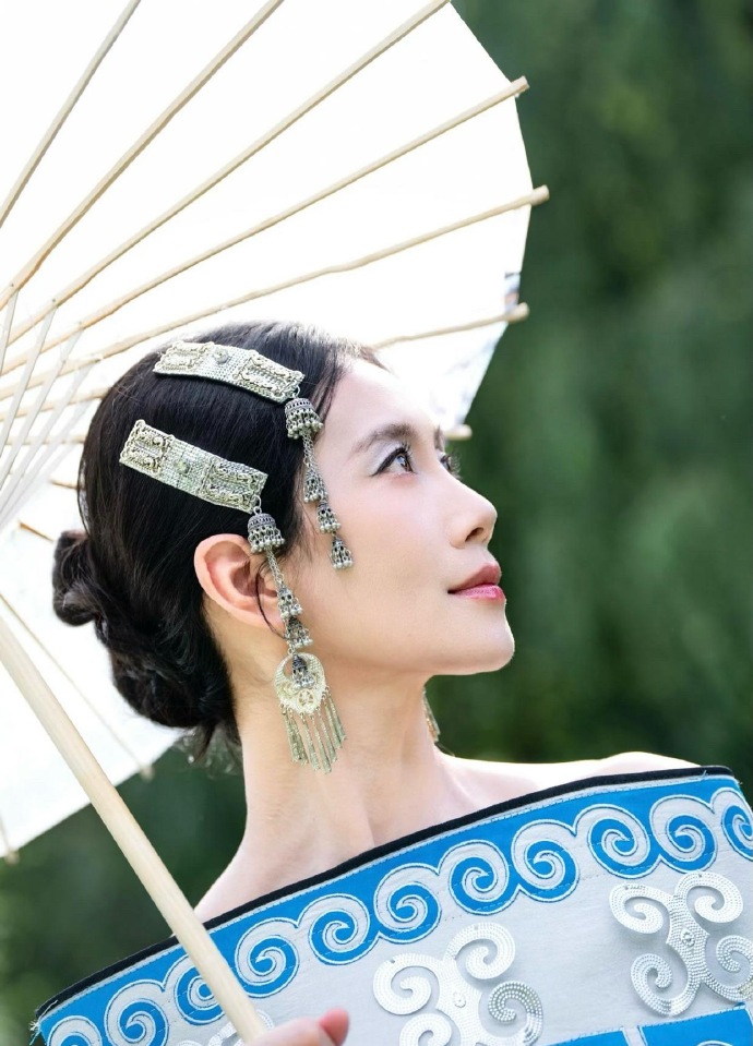 温峥嵘的骨相比较硬朗,所以面相偏男相。但她这身民族风打扮还是很成功的,整个人都变柔和温婉了,看起来也年轻不少。