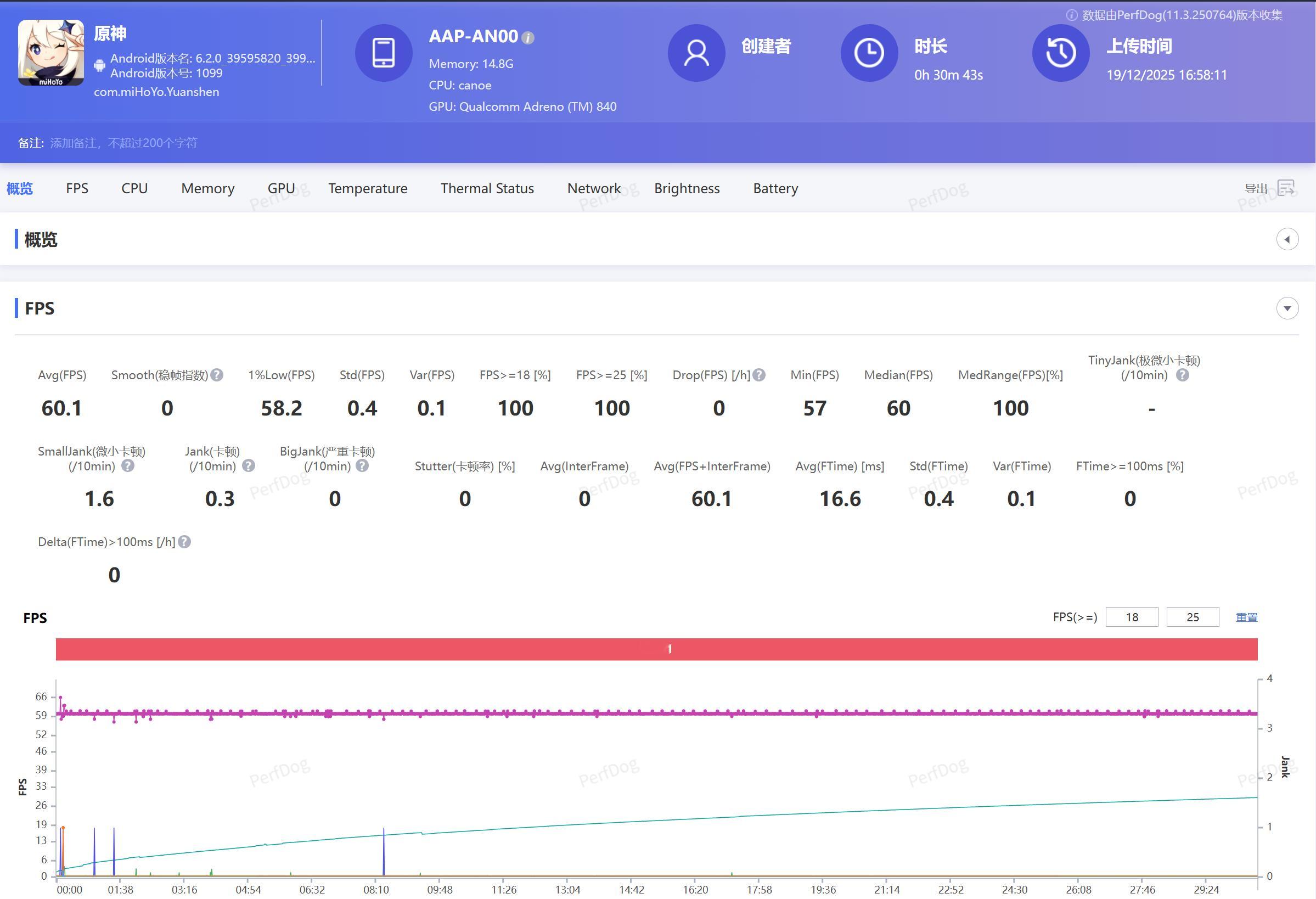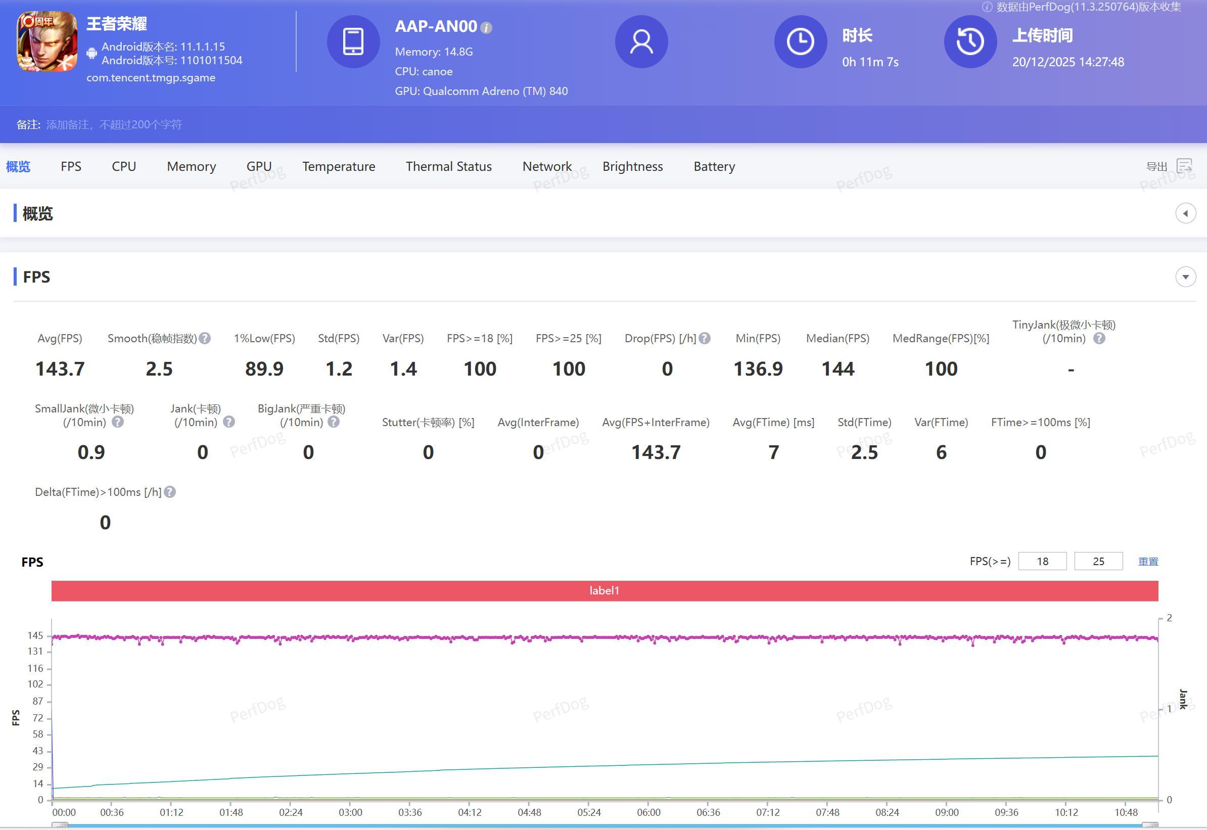 荣耀WIN这次说各项能力都夯到顶,那么它的的游戏性能表现到底有多强,路飞也专门进行了游戏测试,并使用Perfdog软件对游戏帧率进行了记录。首先是国民手游王者荣耀,要知道荣耀WIN是支持144FPS极致帧率的,在超高分辨率的模式下,单局游戏的平均帧率达到了143.7帧,整局游戏无论打怪还是团战都是在极致满帧的状态下进行,丝毫没有感受到一点点卡顿,游戏体验满分。然后又进行了30分钟的原神测试,同样是60帧高帧率模式,平均帧率也达到了60.1帧。整场游戏下来,无论是画质还是游戏技能效果的振感反馈也都非常棒,而且整场游戏下来机身也仅仅是有点温热而已。11分钟左右一局的王者荣耀,荣耀WIN耗电1%左右。画质和帧率都开启极致模式的情况下,30分钟的原神也只耗电4%,这个续航能力在目前的手机行业应该无出其右了吧。