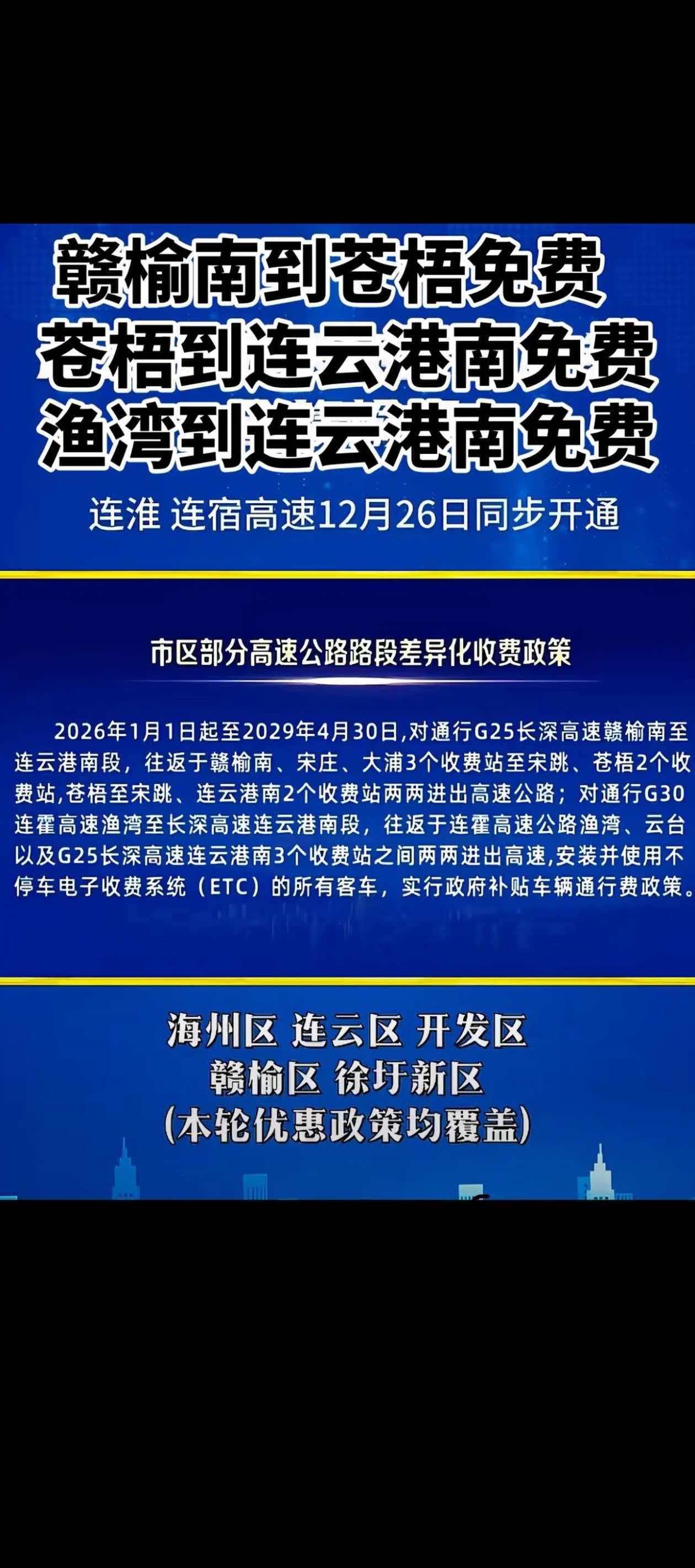 12月25日,连云港交通局召开市区部分高速公路路段差异化收费政策新闻发布会,简单地说就是连云港主城区与其他各区之间高速往返进行费用补贴。 连云港主城区在海州区,其他各区距离海州区的距离一般在40公里左右,居民来往交通不便,累计通行费用较多,给其他非高速路带来一定的通行压力。 现在,连云港实施通行费用补贴已经是第二轮了。 盐城是江苏面积最大的地级市,大丰区到主城区也有40公里左右,而东台、滨海、响水到主城区的距离就更远了,有的都超过100公里了。 早在盐洛高速大丰港支线段建成通车前,就有传言说大丰区来往盐城高速会免费通行,可直到今天也没有免费。 那盐城会不会借鉴连云港的做法呢?目前,盐城与大丰、阜宁之间虽然有了快速路,没有通行费用,但是通行时间上并没有高速快捷。而东台、射阳等其他多个县市并没有快速路到盐城,只能通过高速通行,响水县往返盐城近300公里,通行费用需要140元左右。 实行高速通行费用补贴可以促进县市与大市区的人员交往,让广大居民享受快速便捷的跨区通行服务,降低出行成本,促进大市区与区县的融合,对当地经济发展起到激活作用。 毕竟,在短期内盐城修建到东台、响水等县级城市的快速路有一定的困难,这些快速路距离长、投资大,财政资金压力是非常大的。而采取高速通行费用补贴的方式,是以较少的资金解决盐城主城区与区县间快速连通问题的惠民政策。因此,连云港市的做法有很大借鉴意义。