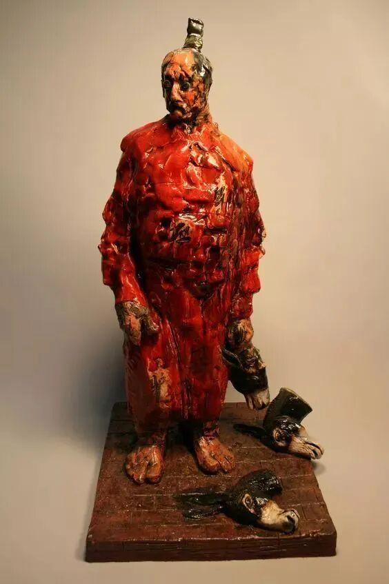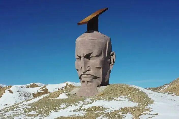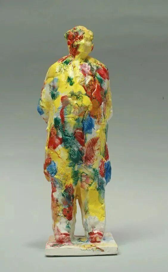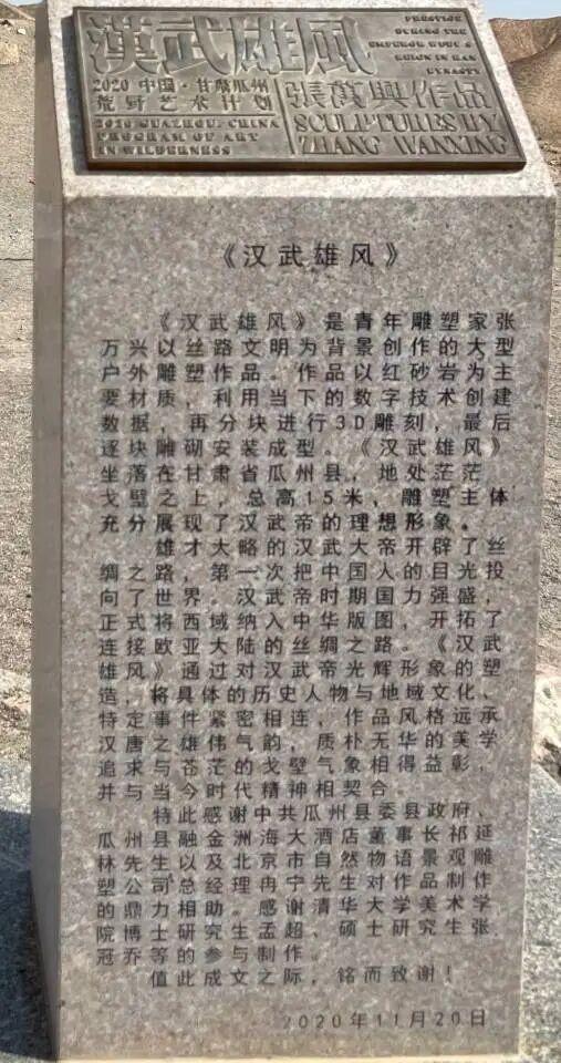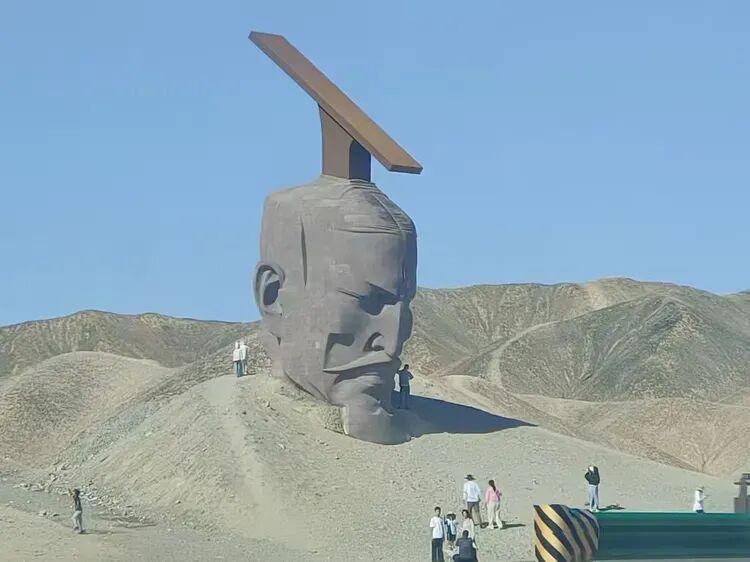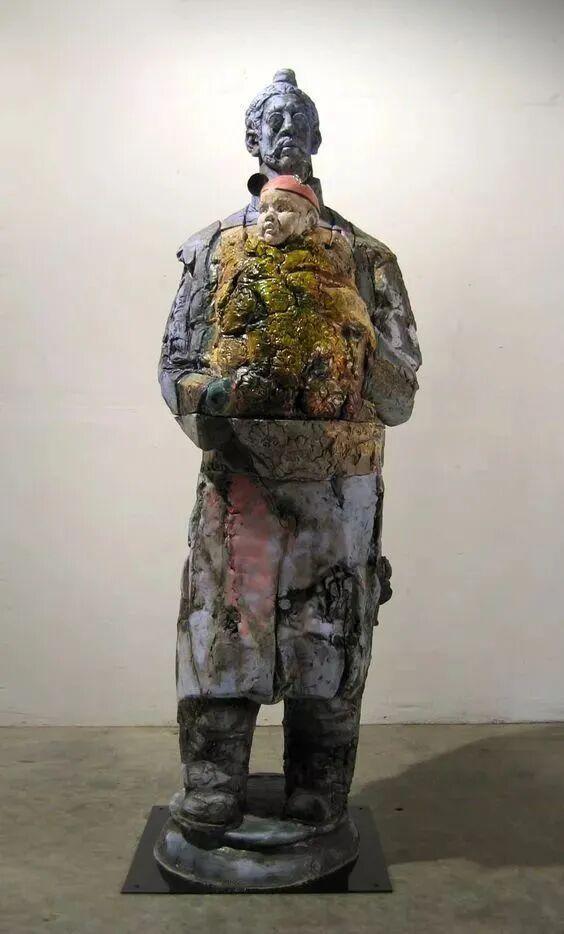 这个雕塑名叫“汉武雄风”,位于甘肃瓜州大漠中。名字取得这么好,然而,却只有一个头,紧闭双眼皱着眉头表情痛苦,无论从哪个角度看,都感觉是古代的一种酷刑:活埋。让真正崇敬汉武帝的人看了非常不舒服。 根据雕塑旁边的碑文介绍,这是雕塑家张万兴2020年11月20日的作品,才五年多时间。 然而奇怪的是,这位“著名雕塑家”,其实早就改名了,新名字是“张万新”。1961年出生在长春,1985年毕业于沈阳鲁迅美术学院雕塑系,1996年获旧金山美术学院硕士学位并留校任教,2010年起在加州大学伯克利分校美术系任教至今,现在是一个美籍华人。 从以上信息来看,这应该是张万新在美国多年后的作品。 在汉武雄风雕塑之前,他的代表作是“新兵马俑”的系列作品: 这组兵马俑,要么闭着眼,要么戴着墨镜,身上糊着五颜六色的块状物,看起来黏黏糊糊的,有一种不适感。人物也显得憔悴疲累,毫无气势,怎么看都是丑化。