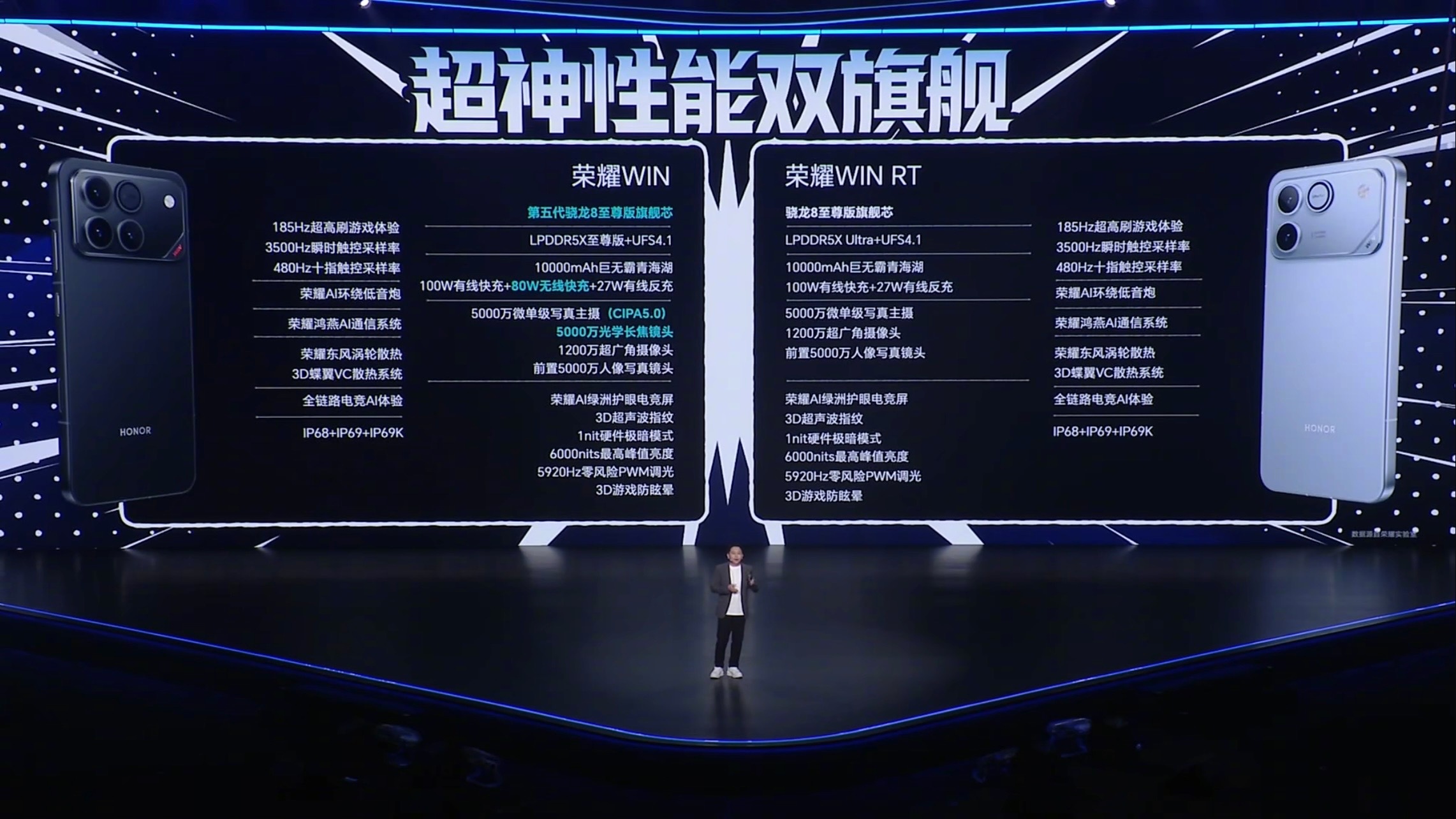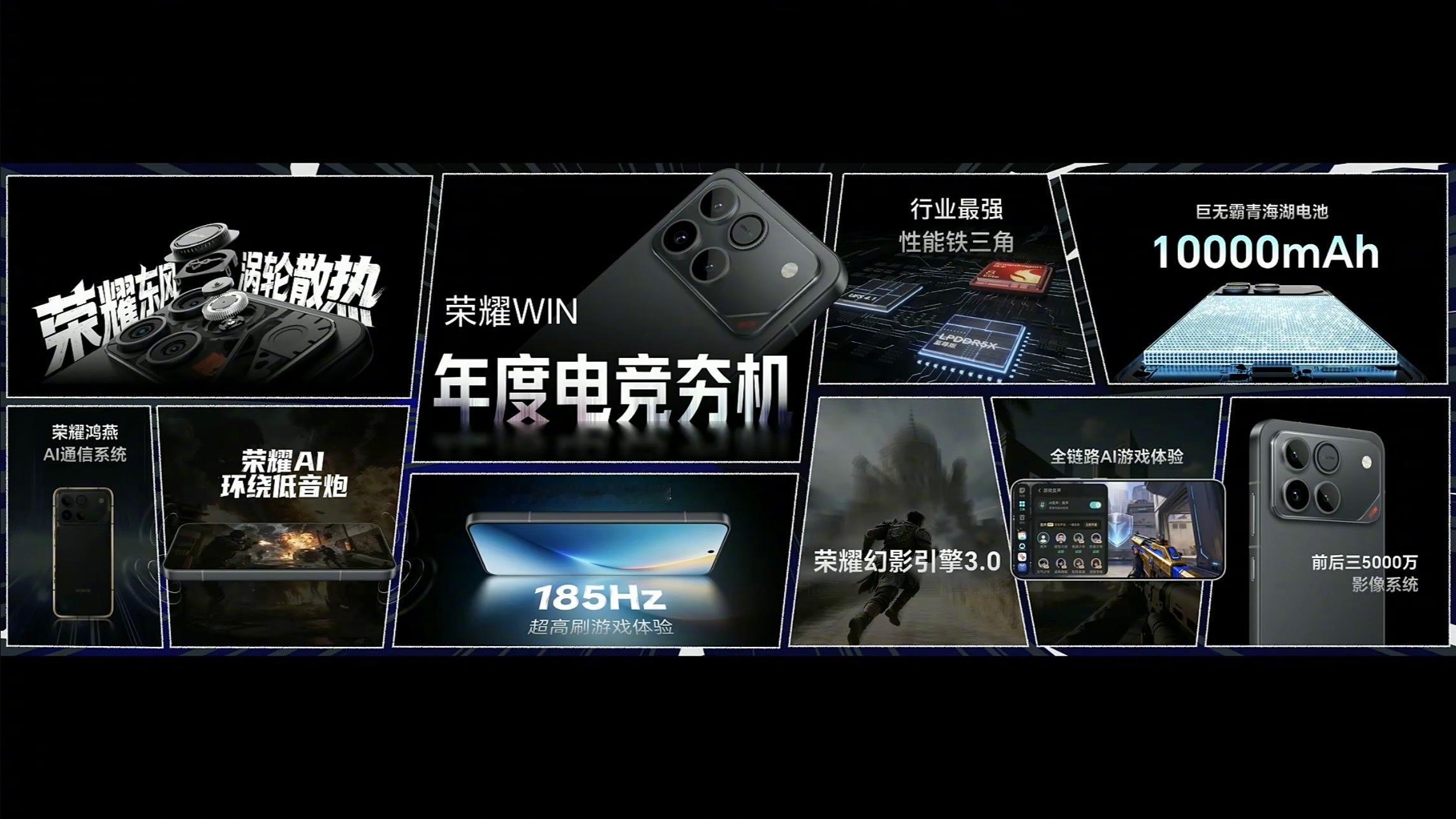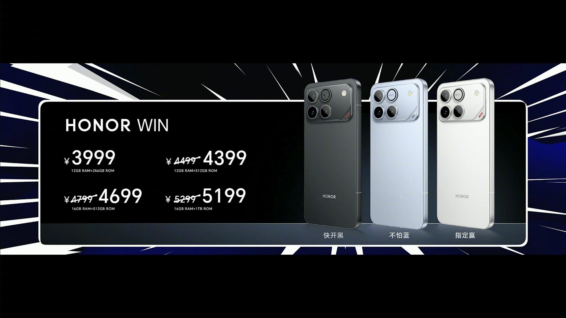 荣耀WIN年度电竞最夯机荣耀WIN荣耀正式发布全新电竞旗舰荣耀WIN系列。荣耀将WIN系列明确定位为“为电竞而生”的性能新支线,主打长时间高帧稳定输出与重度游戏场景体验。外观方面,荣耀WIN系列采用更偏电竞风格的硬朗设计语言,机身厚度控制在8.3mm,搭配雾面金属中框与超轻超薄玻纤背板。背部大中框弧度设计,弧线占比高达85%,官方称之为“掌适曲线”,长时间横握游戏时更贴合手掌。配色上提供「指定赢」「快开黑」「不怕蓝」三款配色。荣耀WIN全系搭载10000mAh青海湖巨无霸电池,配合荣耀都江堰电源管理系统与HONOR E2能效增强芯片,实现真正意义上的“重度游戏续航”。充电规格同样拉满,支持100W有线超级快充,并支持最高27W有线反向充电。性能方面,荣耀WIN 搭载骁龙8 Elite Gen5处理器,WIN RT则采用骁龙8 Elite,均配备LPDDR5X至尊版内存与UFS 4.1存储。全系引入荣耀幻影引擎3.0,通过AI渲显分离技术,对卡顿帧进行预测与重构,带来更稳定的长时间帧率表现。配合独立侧翼电竞天线,即便在复杂网络环境下也能保持稳定连接。为了压住如此激进的性能释放,荣耀在散热系统上直接“上风扇”。荣耀WIN系列搭载荣耀东风涡轮散热系统,内置行业体积最小、重量最轻、转速最高的微型风扇,最高转速可达25000转/分钟,并配合行业首创直驱疾冷风道设计,实现双360°环绕进风。再结合3D蝶翼VC散热结构,使整机在高负载下依旧保持冷静,安兔兔跑分更是刷新纪录,达到440万分。屏幕方面,荣耀WIN系列配备6.83英寸LTPS OLED直屏,支持185Hz超高刷新率。同时引入5920Hz零风险PWM护眼调光、3D游戏防晕眩等护眼方案,并支持6款手游实现超帧与超分并发运行,画面流畅度提升达54%,也是行业首批实现“AI超帧+AI超分”并发的电竞手机。影像方面,荣耀WIN搭载50MP主摄+50MP长焦+12MP超广角组合;荣耀WIN RT则为50MP主摄+12MP超广角,满足日常记录与社交分享需求。发布会现场荣耀还宣布与《三角洲行动》赛事达成战略合作,荣耀WIN系列与全新荣耀游戏本系列,正式成为三角洲行动烽火职业联赛指定手机与指定笔记本,进一步强化其电竞属性定位。价格方面:荣耀WIN:12GB+256GB 3999元12GB+512GB 4399元16GB+512GB 4699元16GB+1TB 5199元荣耀WIN RT:12GB+256GB 2699元12GB+512GB 3099元16GB+256GB 2999元16GB+512GB 3399元16GB+1TB 3999元