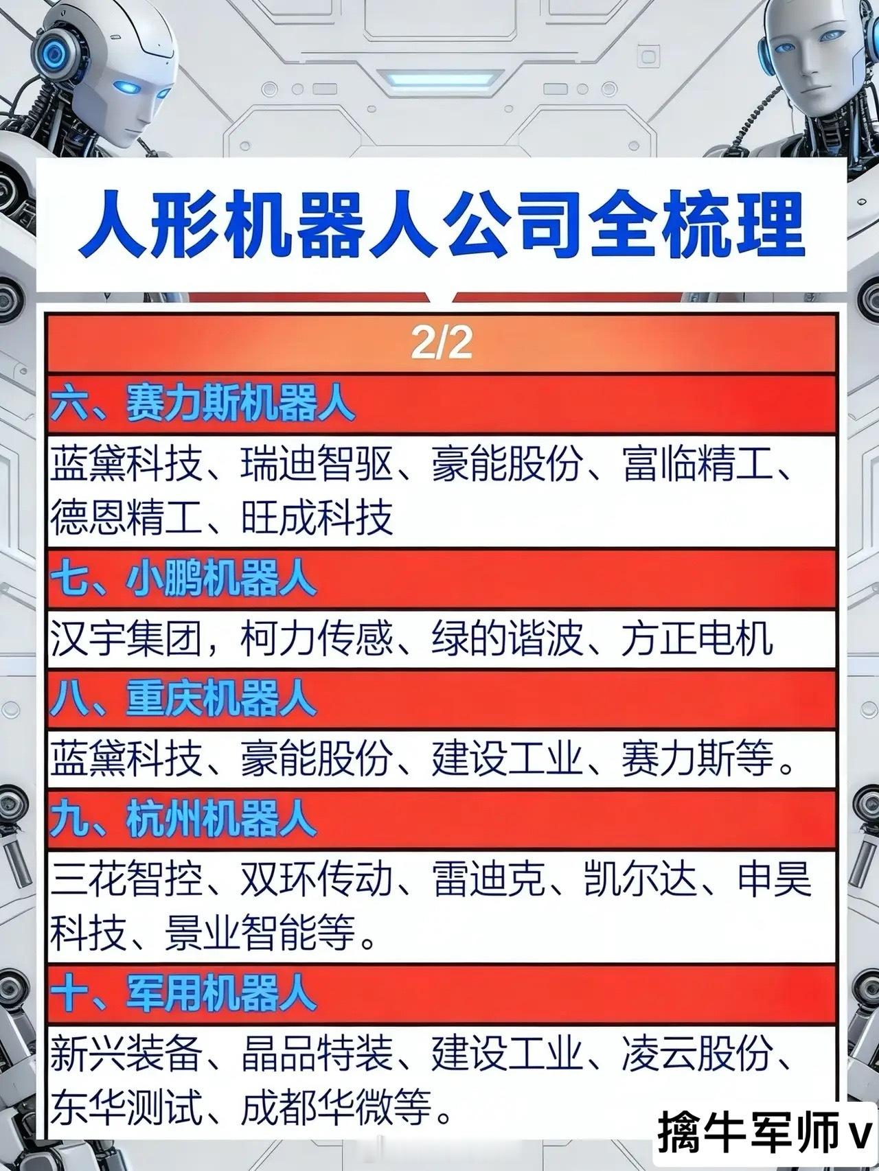 “人形机器人公司全梳理”,按品牌或类型划分,系统整理了与人形机器人相关的企业名单。第一张图主要介绍了五大类:- 英伟达机器人涉及东方精工、搏杰股份、阿尔特、奥比中光、九号公司、天准科技、麦格米特、伟创电气、海晨股份、长盛轴承等企业;- 华为机器人包括拓斯达、禾川科技、科力尔、中坚科技、埃夫特、兆威机电、富临精工;- 宁德时代机器人有爱仕达、东杰智能、通力科技、科大智能、埃斯顿、大恒科技;- 长安机器人涵盖长安汽车、天奇股份、三丰智能、东安动力;- 特斯拉机器人则包括晋拓股份、昊志机电、中大力德、雷赛智能、绿的谐波。第二张图延续梳理,补充了另外五类:- 赛力斯机器人关联的包括蓝黛科技、瑞迪智驱、豪能股份、富临精工、德恩精工、旺成科技;- 小鹏机器人有汉宇集团、柯力传感、绿的谐波、方正电机;- 重庆机器人列出蓝黛科技、豪能股份、建设工业、赛力斯等;- 杭州机器人包含三花智控、双环传动、雷迪克、凯尔达、申昊科技、景业智能等;- 军用机器人涉及新兴装备、晶品特装、建设工业、凌云股份、东华测试、成都华微等。整体来看,这份梳理覆盖了国内外多家知名科技企业及产业链相关公司,涉及消费电子、新能源汽车、智能制造、军工等多个领域,反映出人形机器人产业当前多元化和跨行业融合的发展趋势。