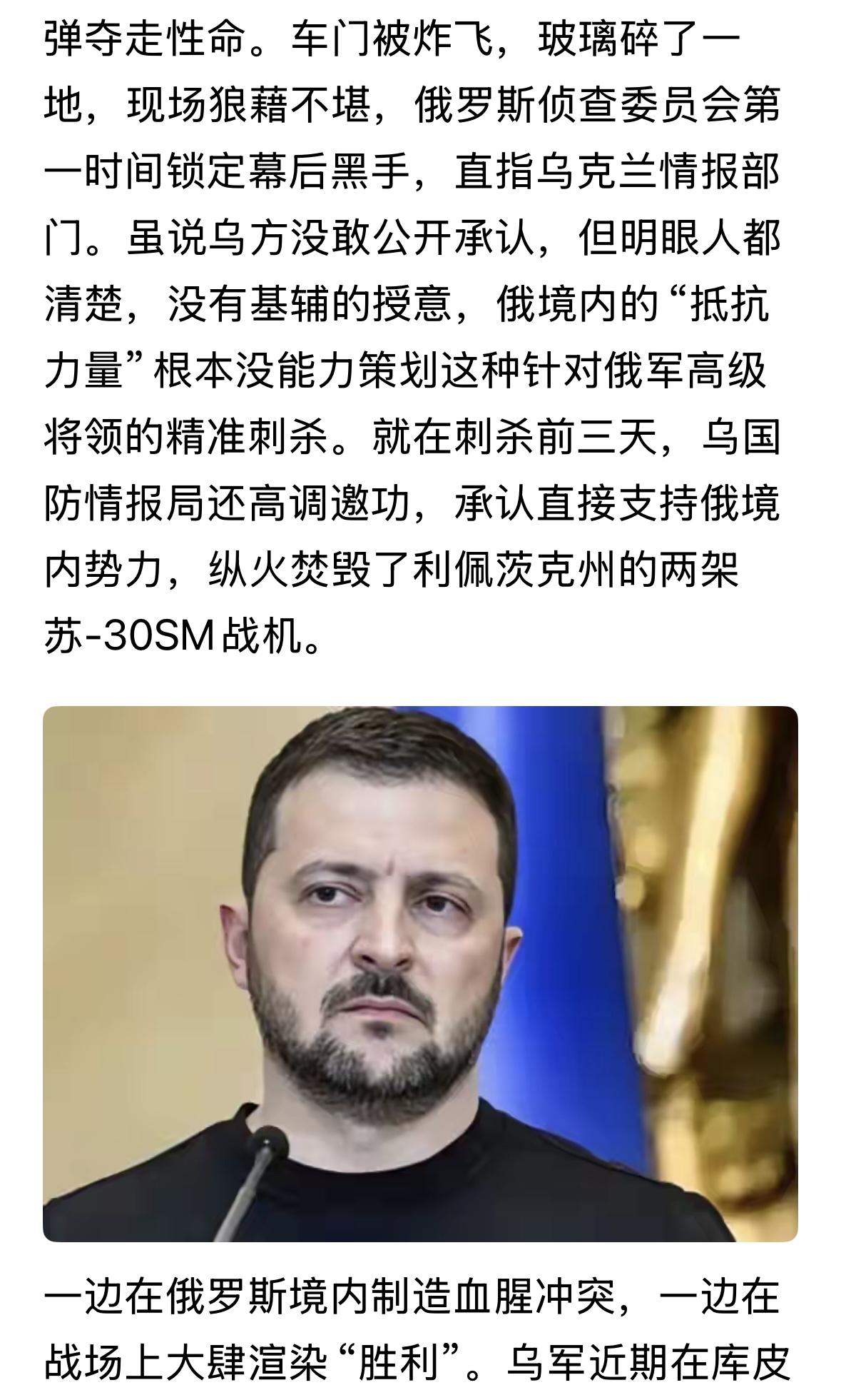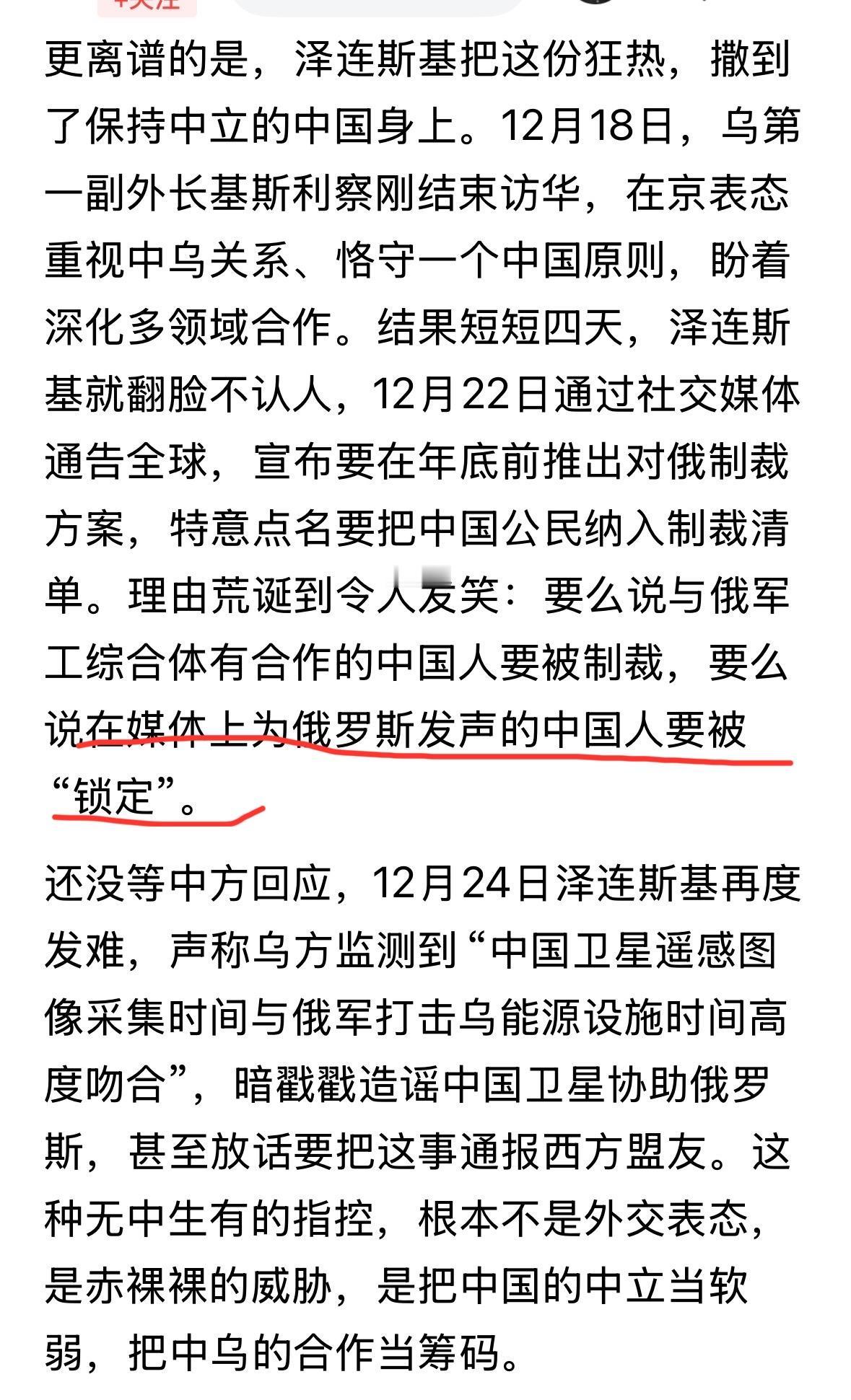 虽然荒唐,令人发笑,泽连斯基把矛头对准中国部分人士,真是一步臭棋,令人难以理解,要么说对与俄军工综合体有合作的中国人进行制裁,要么说要“锁定”在媒体上为俄罗斯发声的中国人。与俄罗斯进行军工合作的应该没有,如果他要制裁,就可能是误伤!在媒体上,也力挺俄罗斯的中国媒体人,成万上亿,比乌克兰人口多好几倍,他怎么锁定?荒唐,可笑!俄粉们肯定不怕,恐怕会有更多的人公开和泽连斯基叫板,来吧……快点来啊!